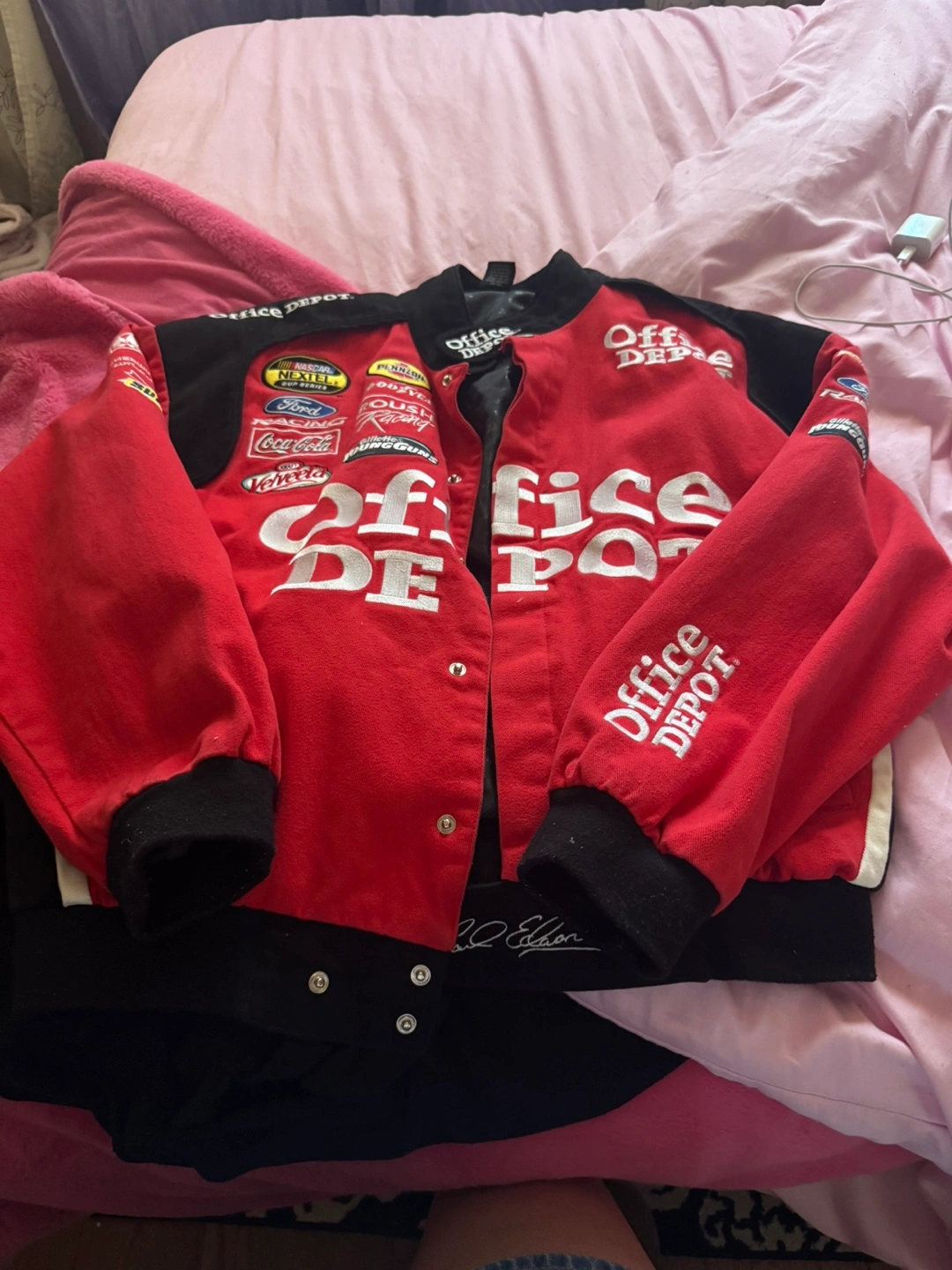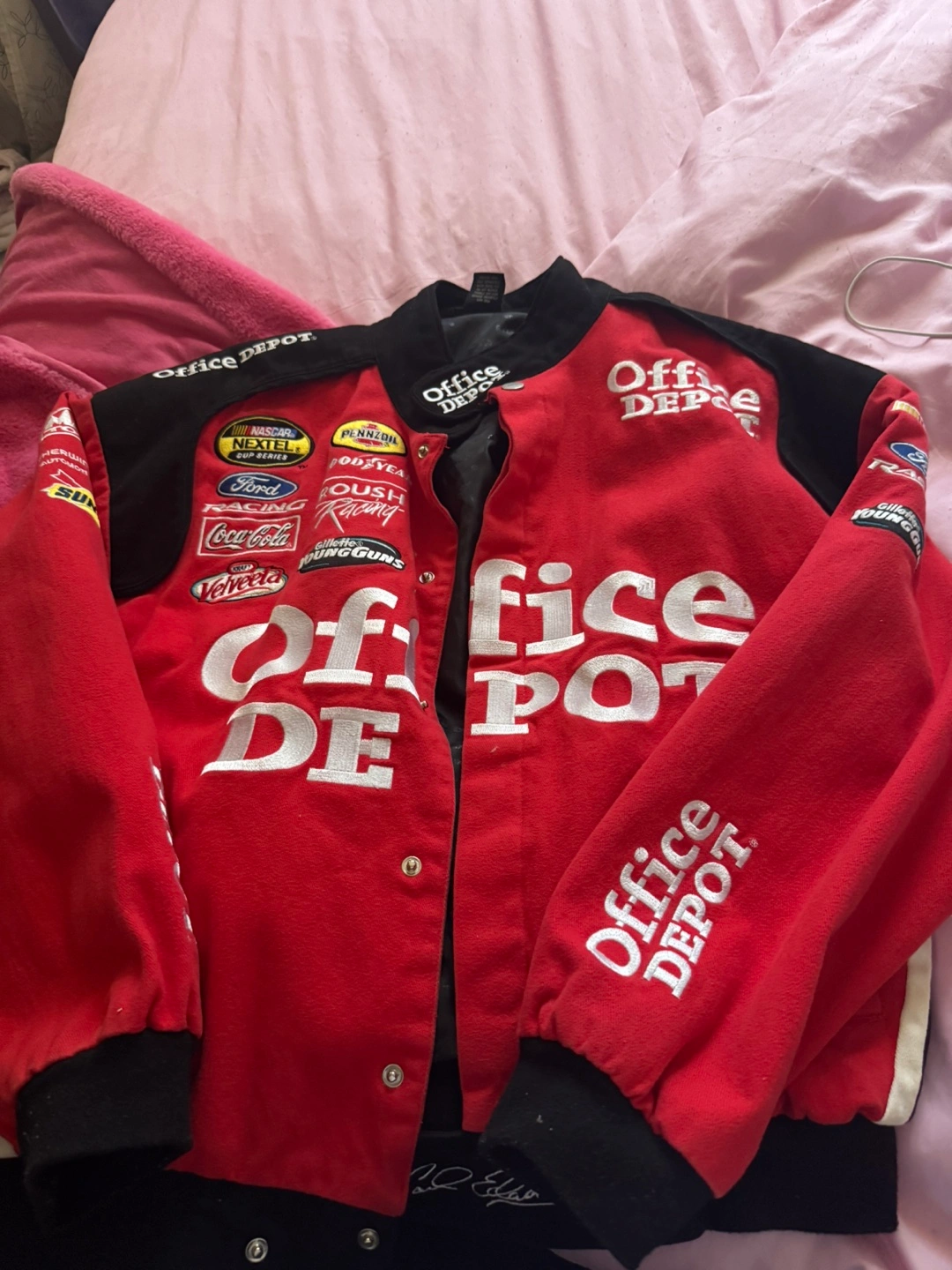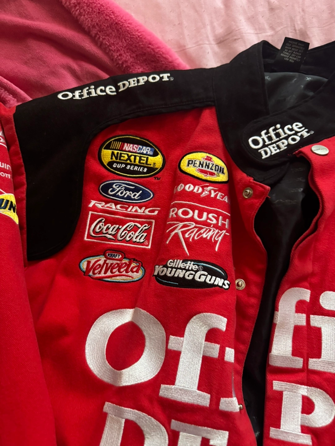Red and black jacket. Features various sponsor logos including Coca-Cola, Ford, and Goodyear. Office Depot branding throughout. Appears to be signed.