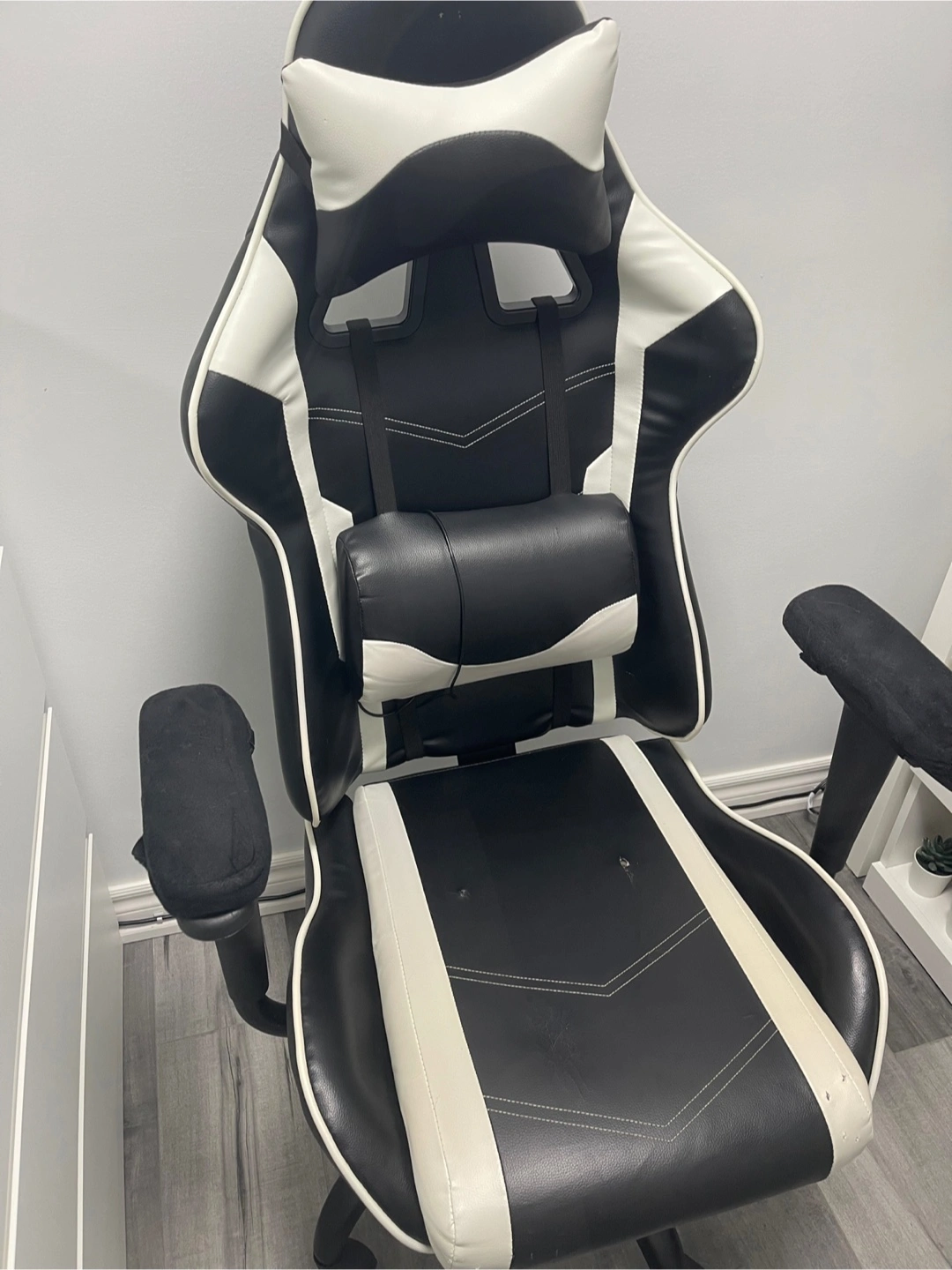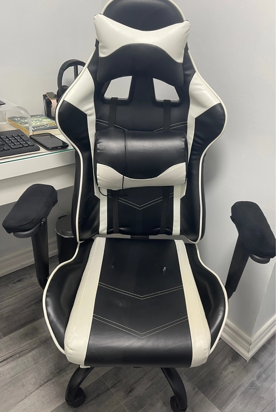 Adjustable height, back and has a leg rest. Includes headrest and mini arm support pillows (in pictures). Great for gaming or working from home.