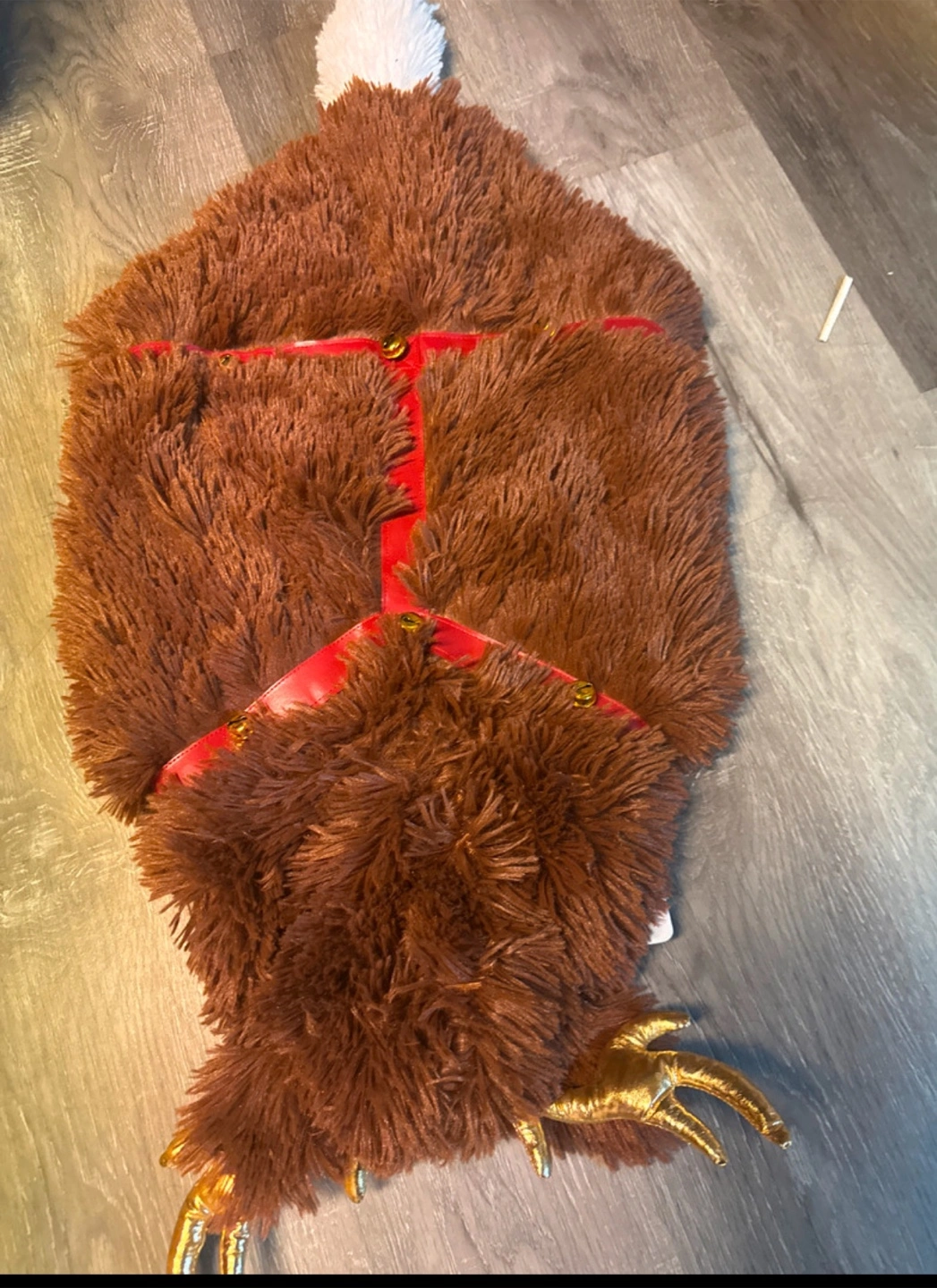 27Adorable pet costume. Brown fuzzy material. Red accents. Gold claws. Looks like a mythical creature.