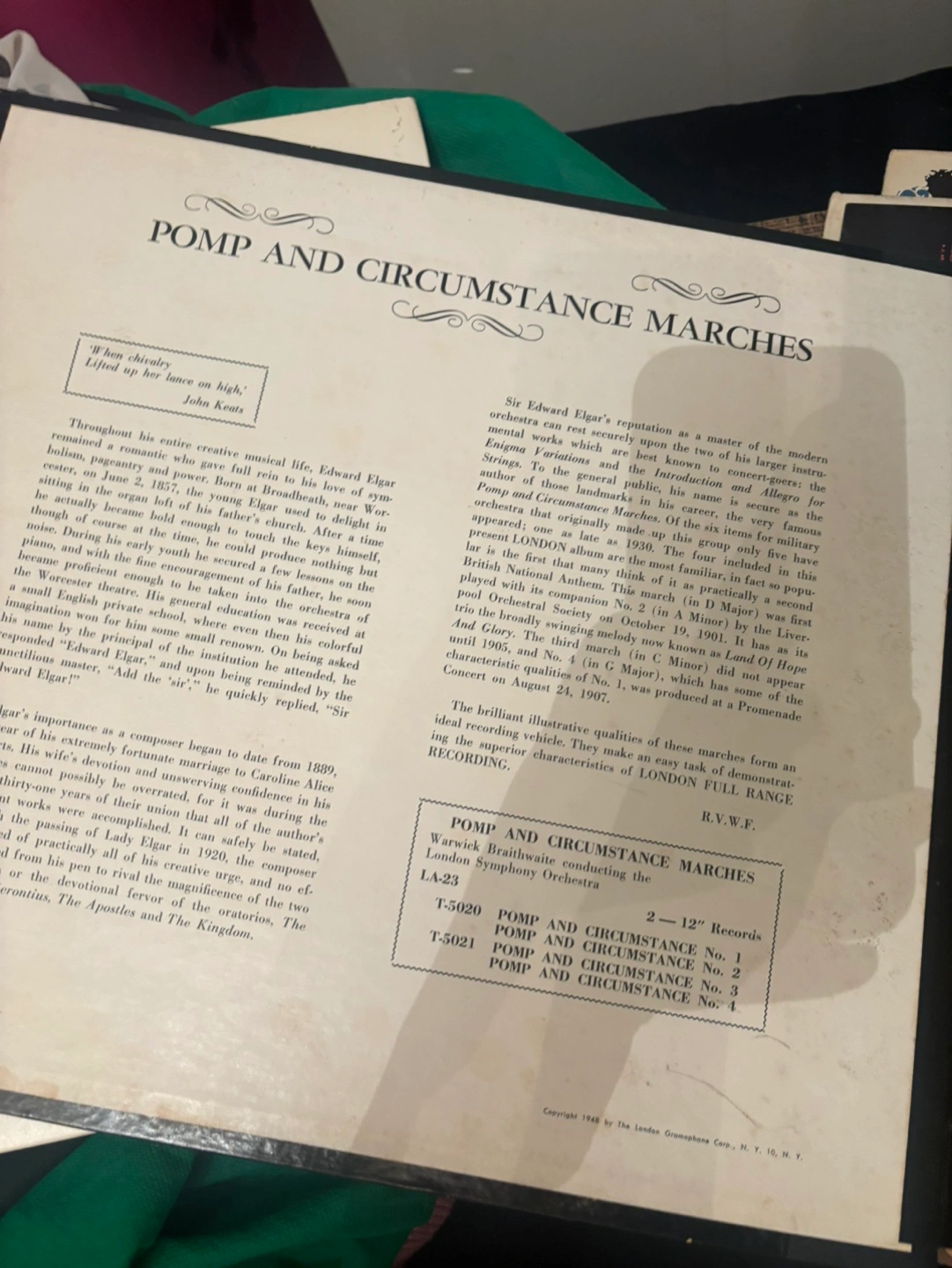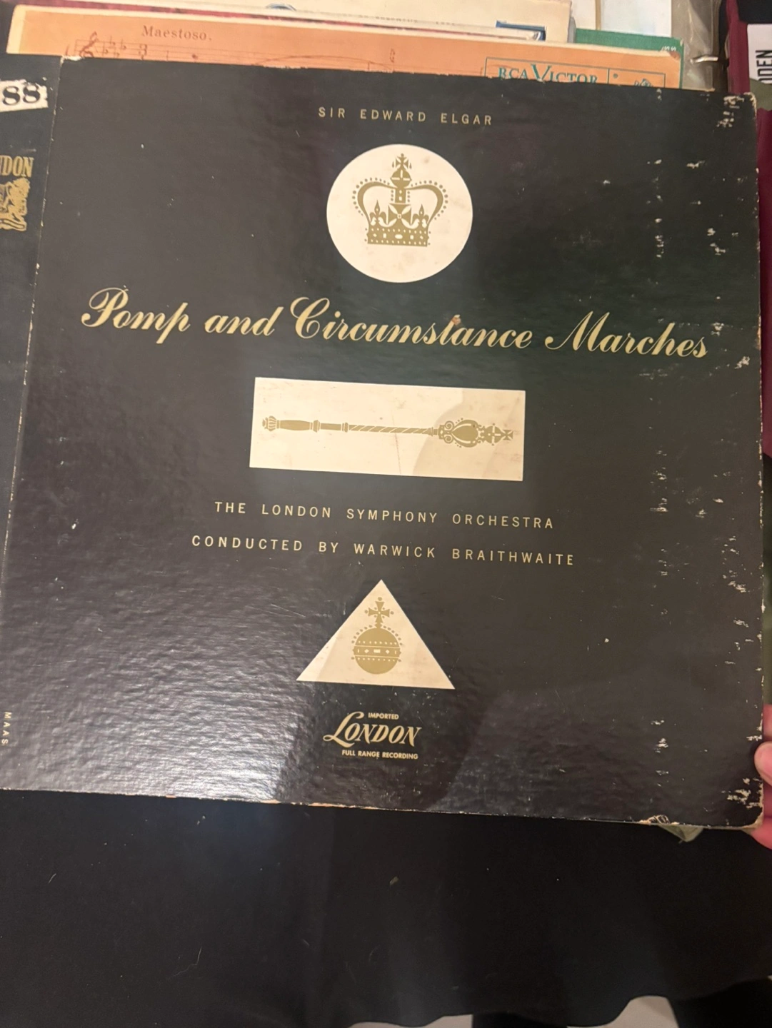 Set of vintage 78 RPM records. Features Pomp and Circumstance Marches by Sir Edward Elgar. London Symphony Orchestra conducted by Warwick Braithwaite. Full range recording. In original cardboard sleeve.
