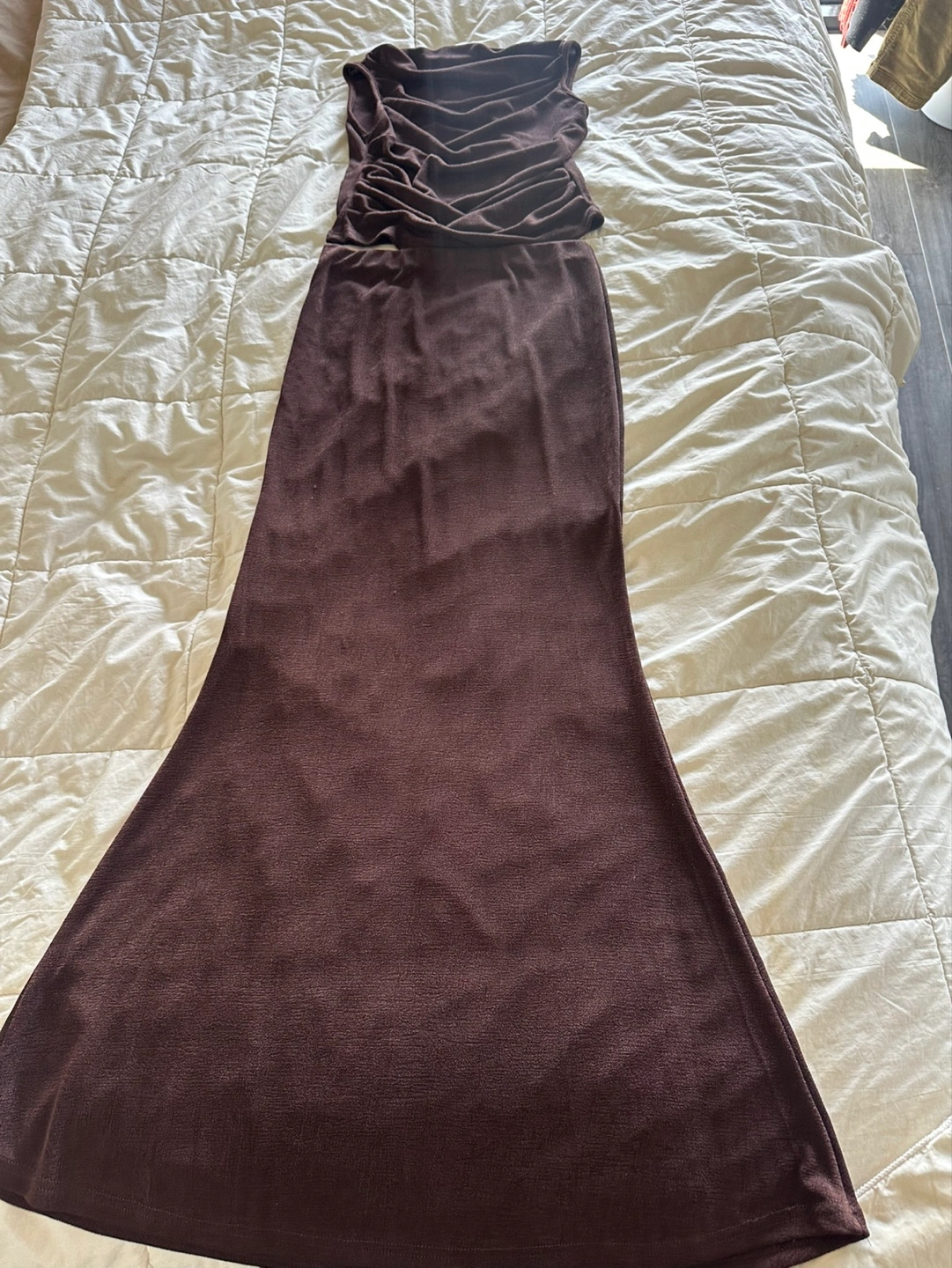 Gorgeous chocolate brown two-piece set. Features a cowl neck sleeveless top and a matching maxi skirt. The fabric is a stretchy knit material. Perfect for a special occasion or evening out.