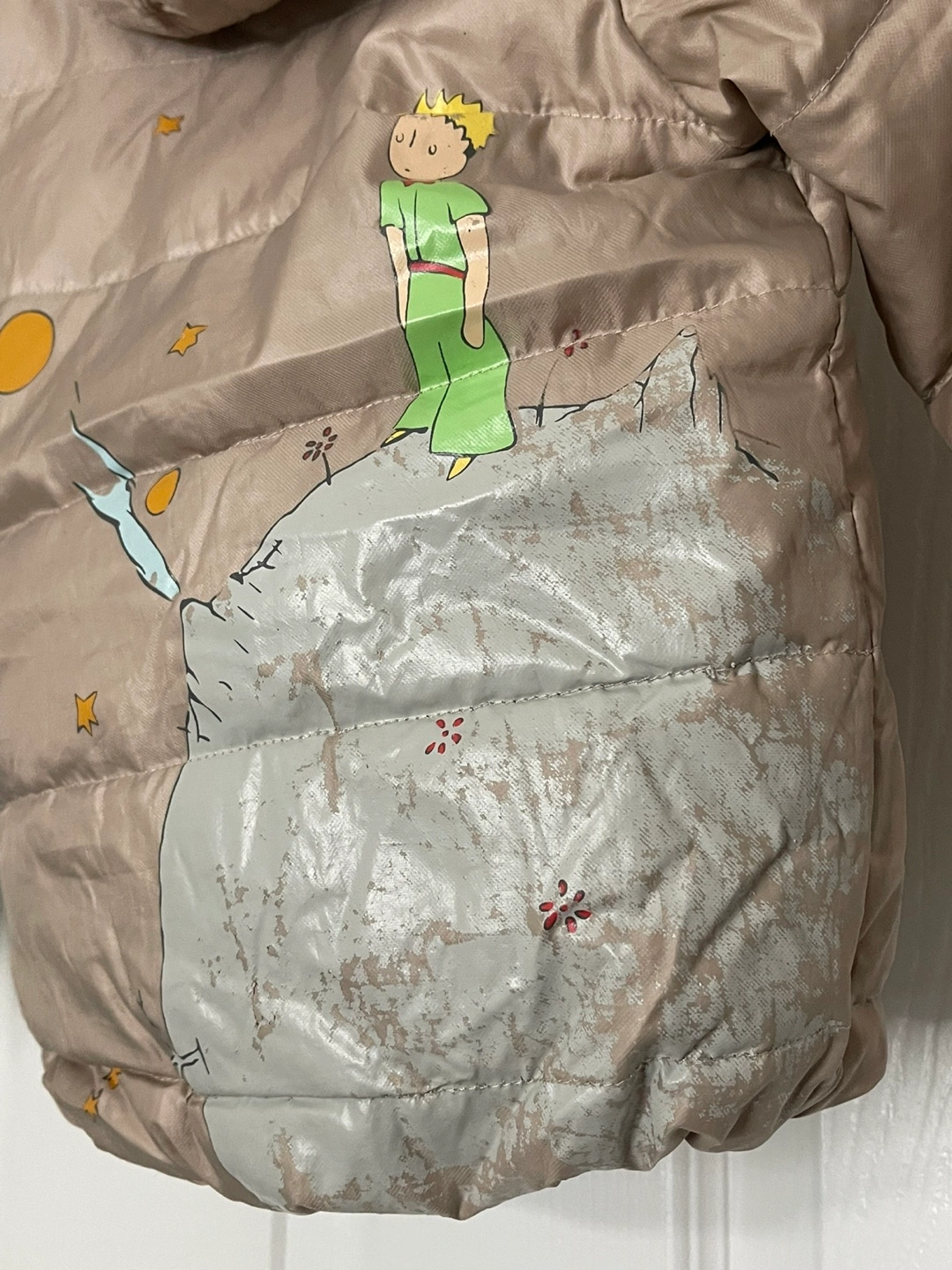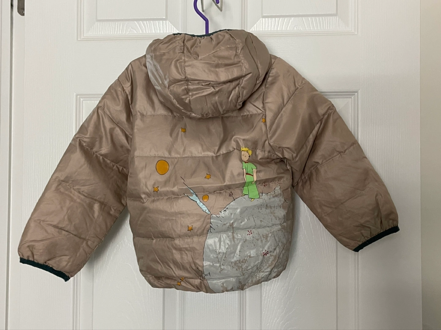 Adorable toddler puffer jacket. Features Le Petit Prince design. Beige colour. Hooded. Zip closure. Two pockets. Excellent for cold weather.