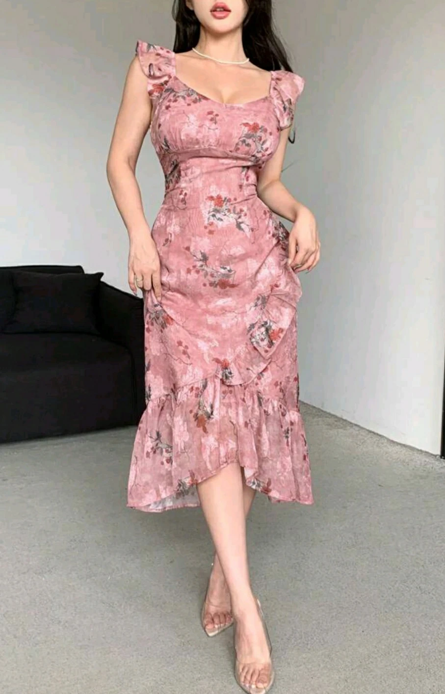 Stunning pink floral midi dress. Features ruffles and a flattering fit. Perfect for a special occasion.