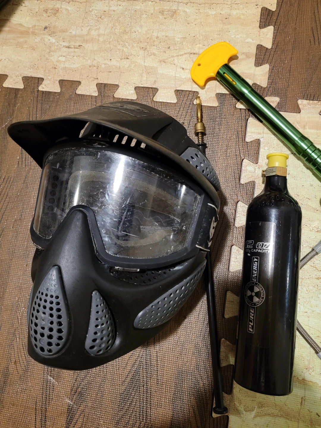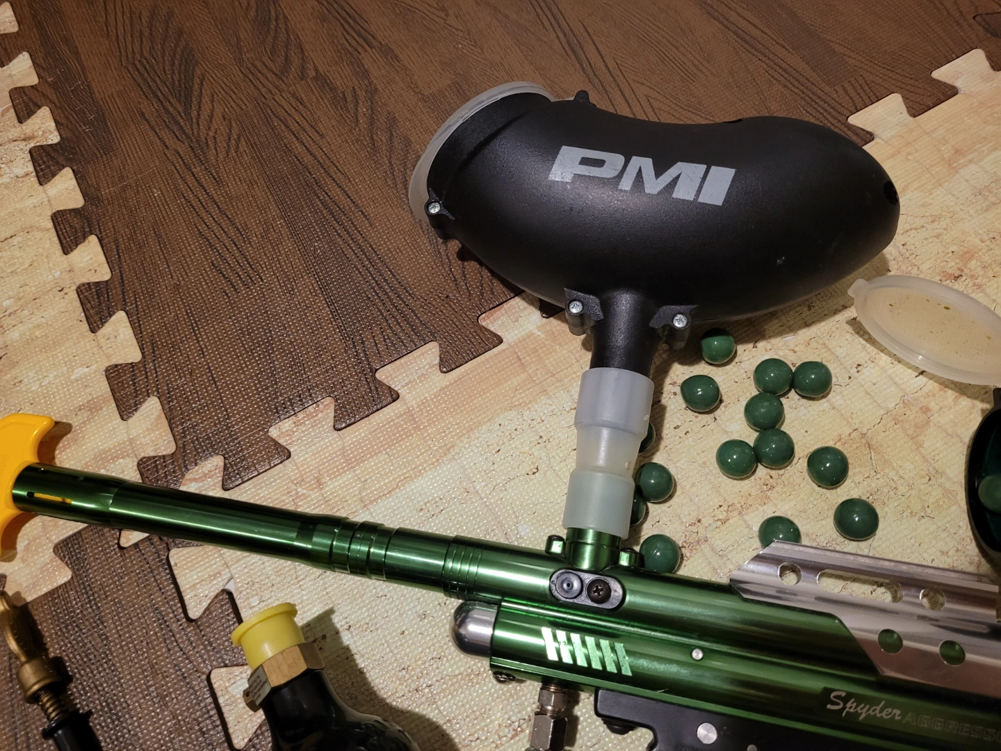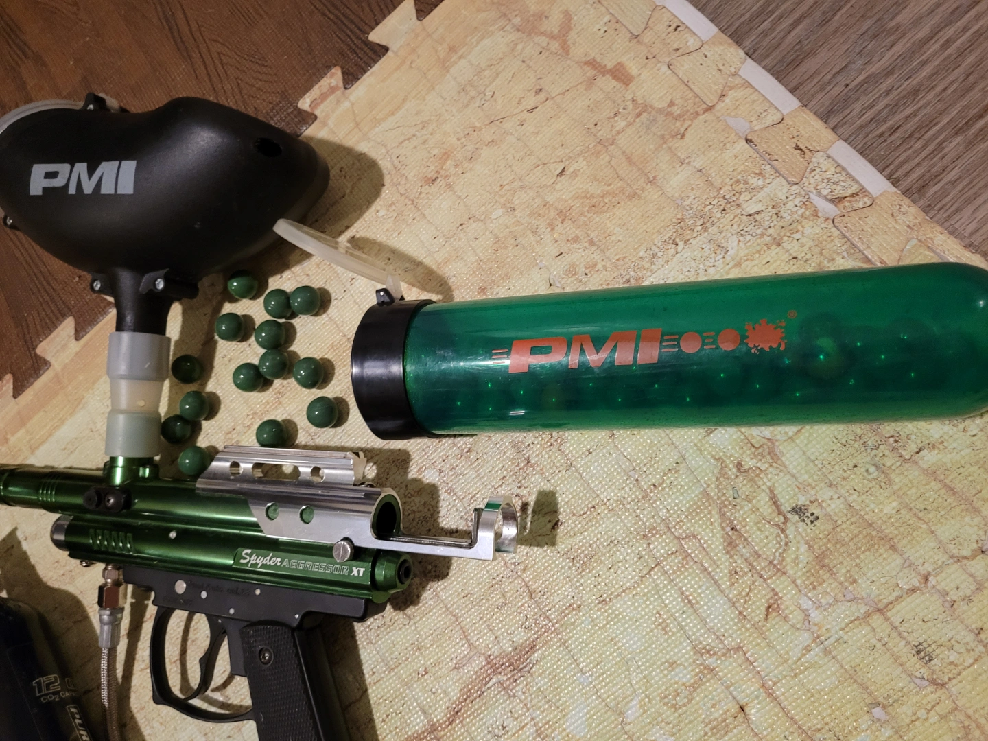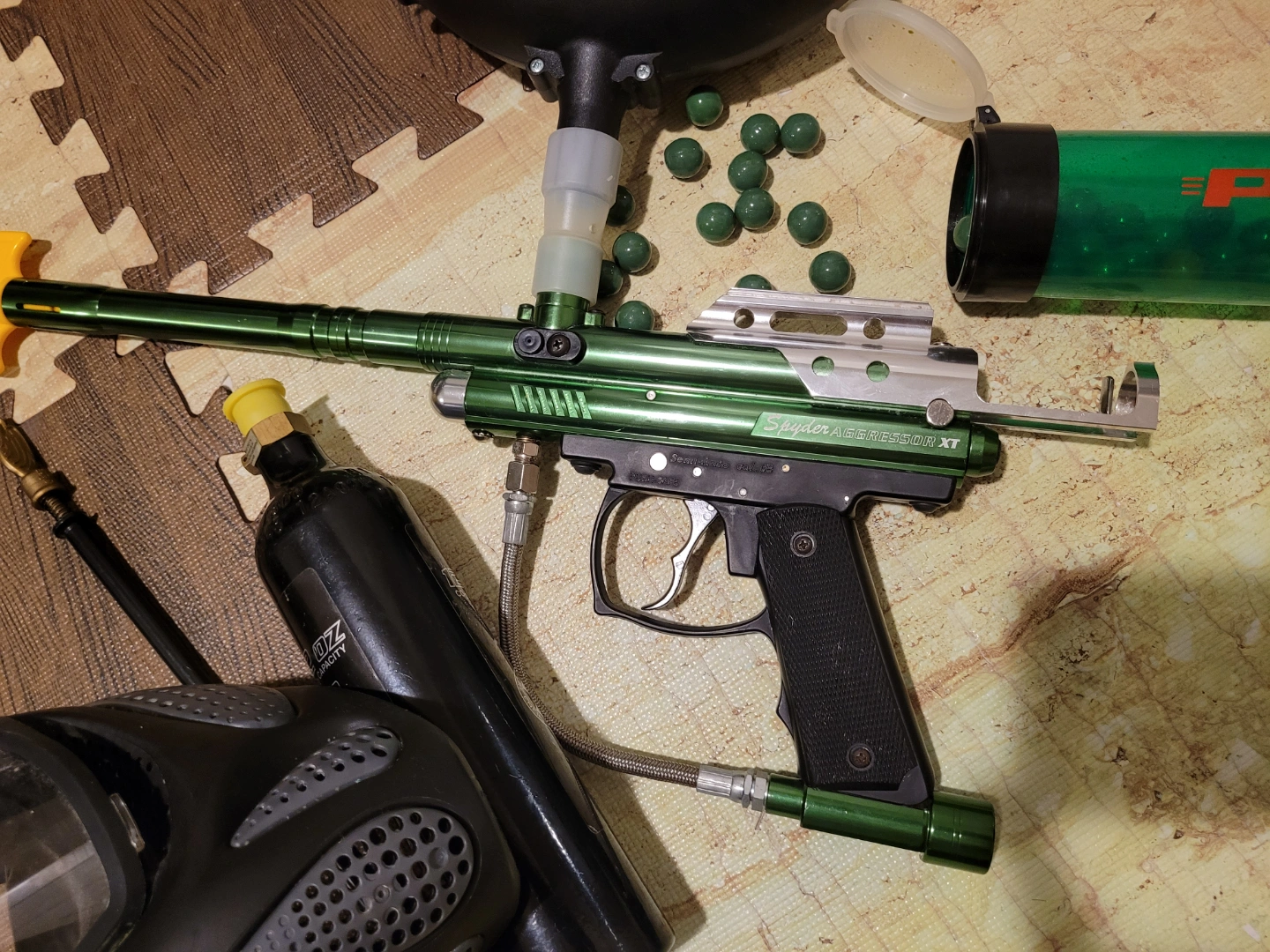 Spyder Aggressor XT paintball marker, green and silver. Includes hopper, mask, goggles, CO2 tank, yellow flag, cleaning rod, and some paintballs. Used, works great, great combo. 180$ OBO. Send me your offer