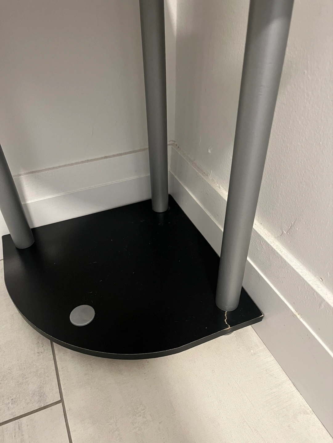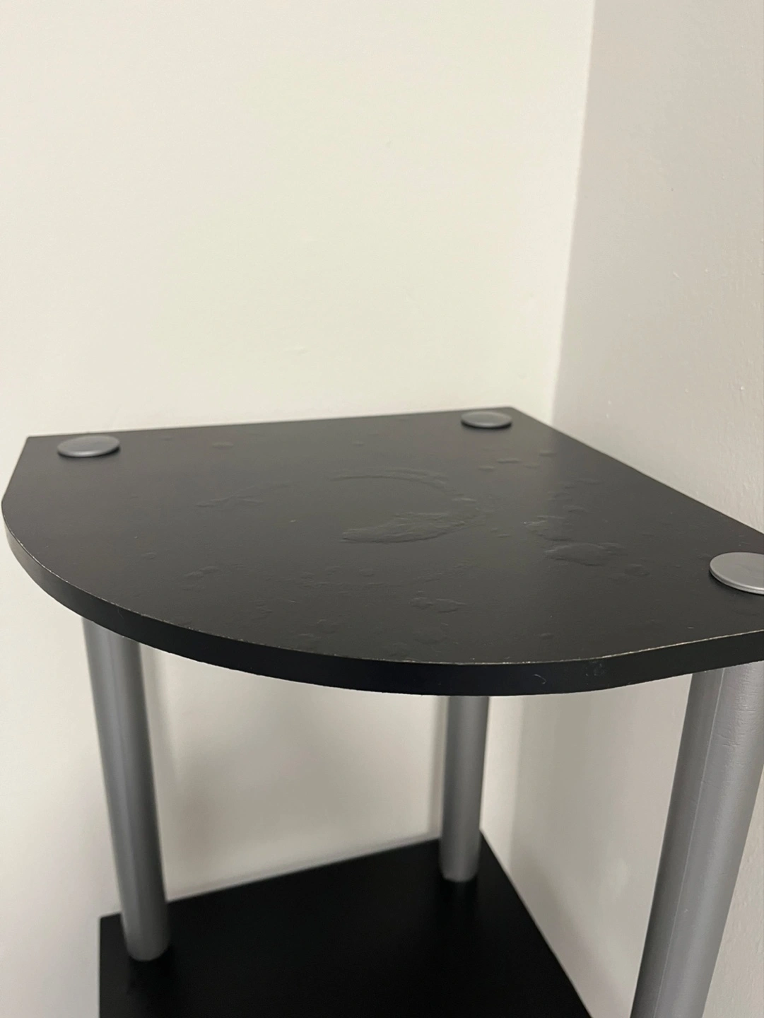 Black shelves and silver supports. Some minor wear and tear. Light and easy to assemble and disassemble