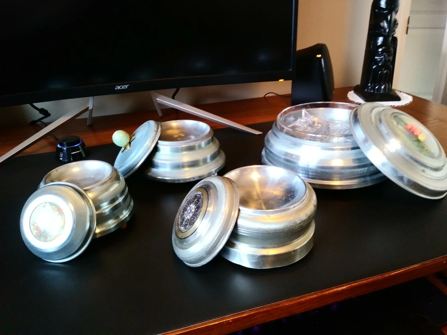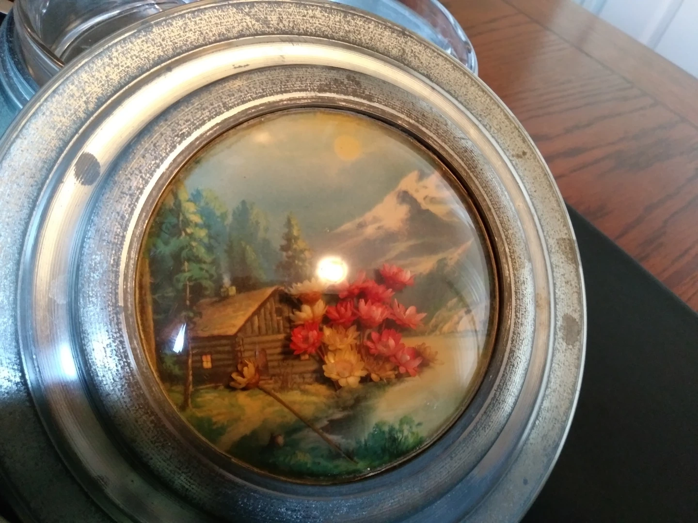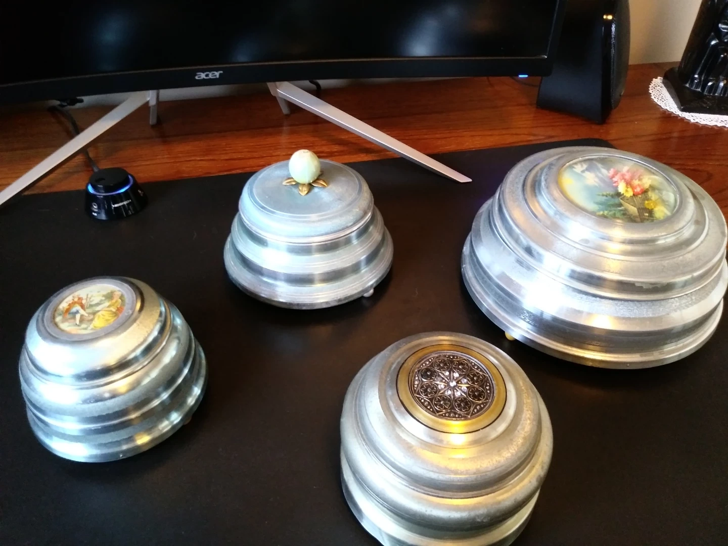 A collection of four decorative music boxes, likely made of metal. Each box features a unique lid design, with one showing a pastoral landscape and another a floral motif. They appear to be wind-up music boxes. These decorative pieces would be a lovely addition to a shelf or dresser. All are vintage grade in amazing clean condition all with individual music pieces $40.00 to $60.00 each