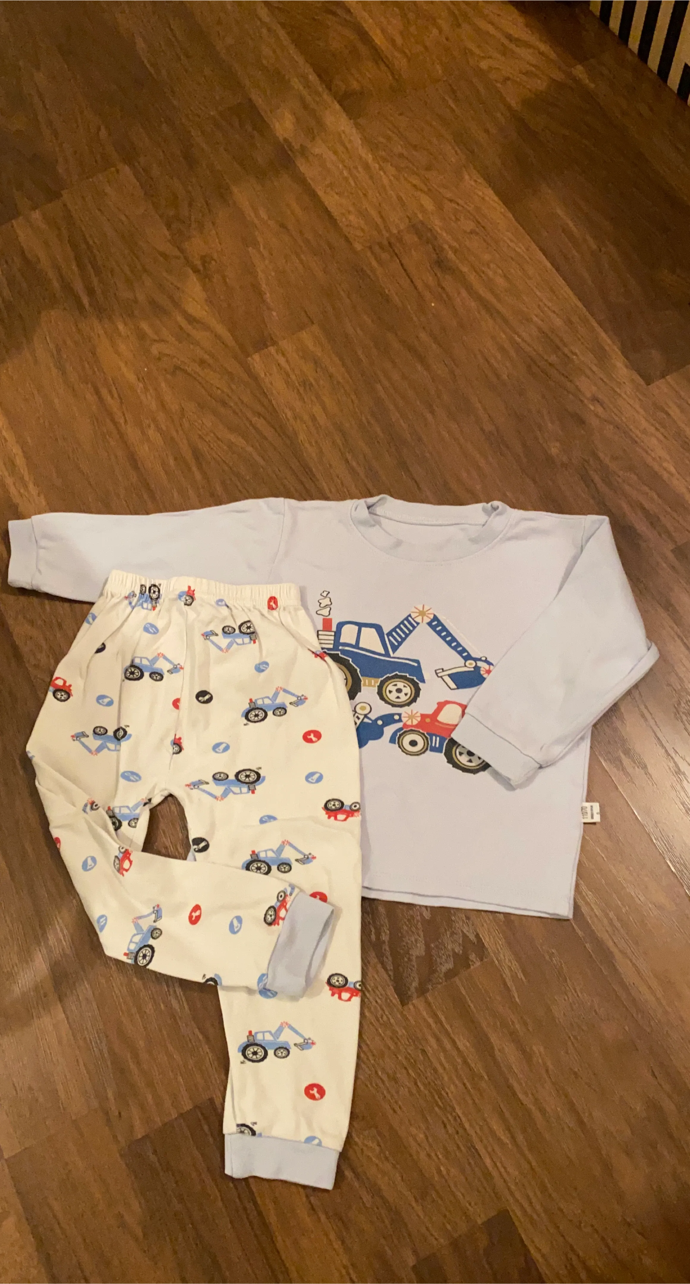 Adorable pajama set for kids featuring a fun construction vehicle print! The set includes a long-sleeved light blue top and patterned pants. Perfect for a cozy night's sleep! Labeled size 100 (or about 3)