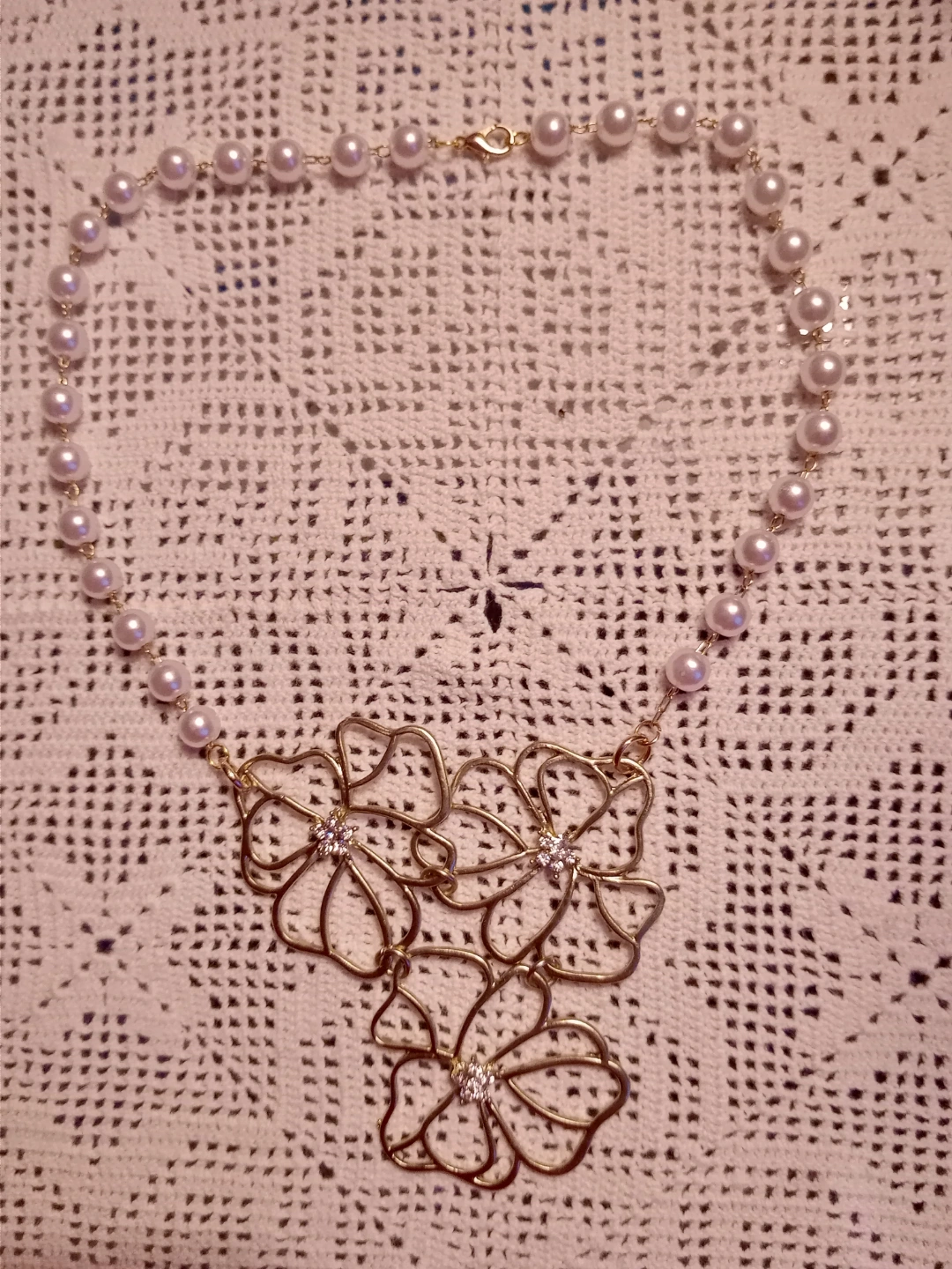 This is a handmade pearl necklace featuring a gold-tone floral pendant with crystal accents, perfect for adding a touch of elegance to any outfit. Being a used item, it possesses a unique characerstic look.