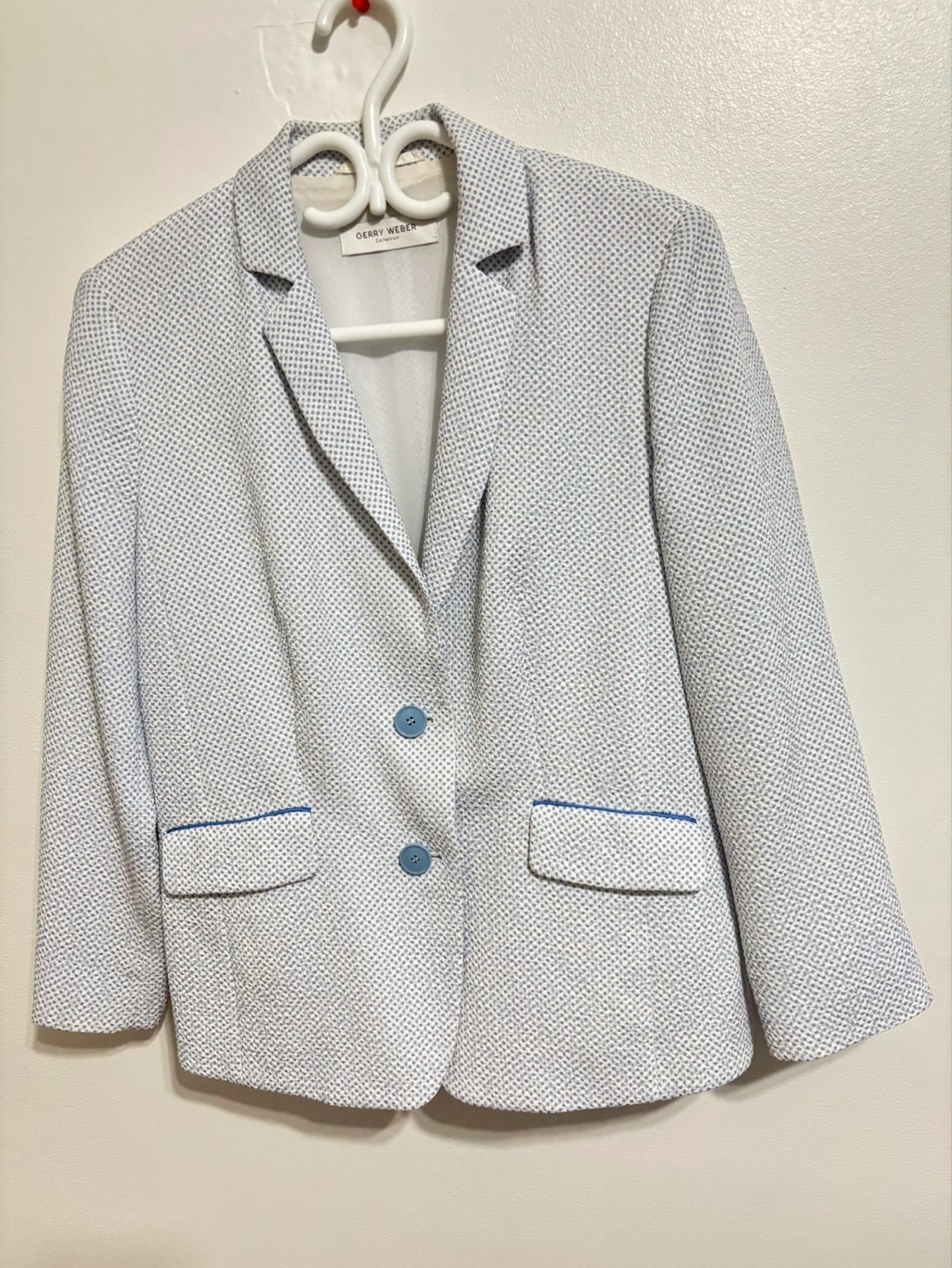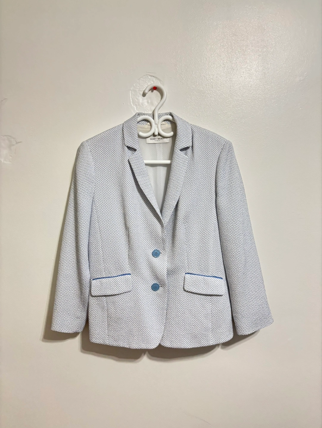 Women's blazer, white with light blue detailing. Two button closure. Pockets. Good condition.