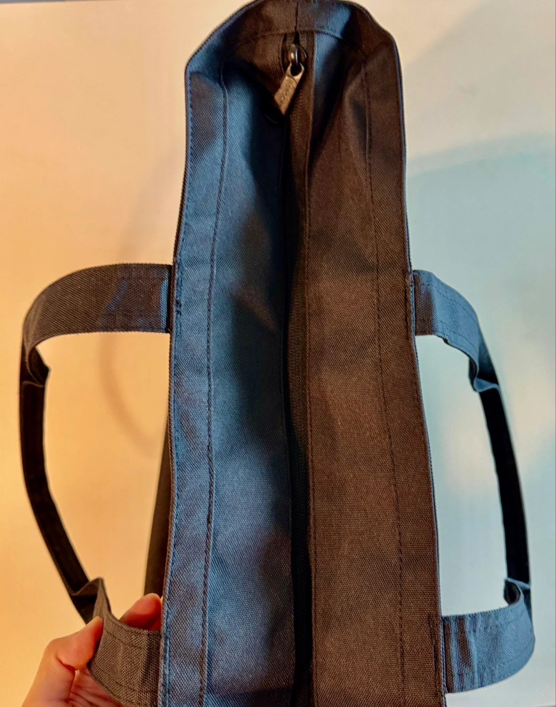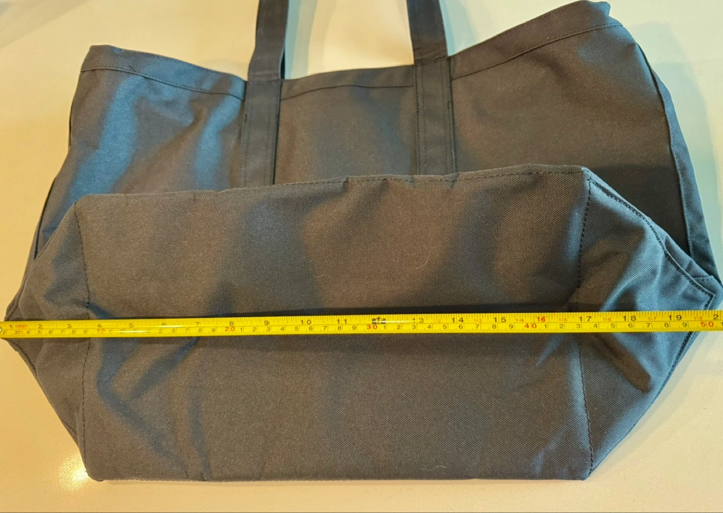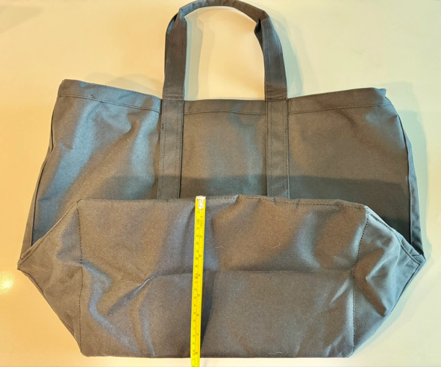 Large black tote bag. Spacious main compartment. Durable fabric construction. Great for shopping or travel. Two carrying handles.