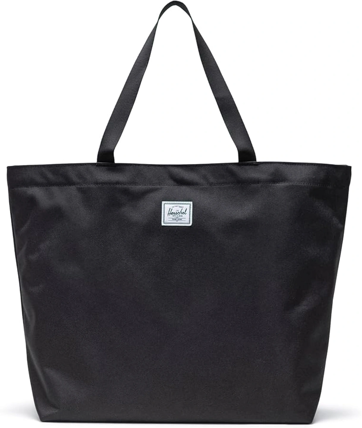 Large black tote bag. Spacious main compartment. Durable fabric construction. Great for shopping or travel. Two carrying handles.