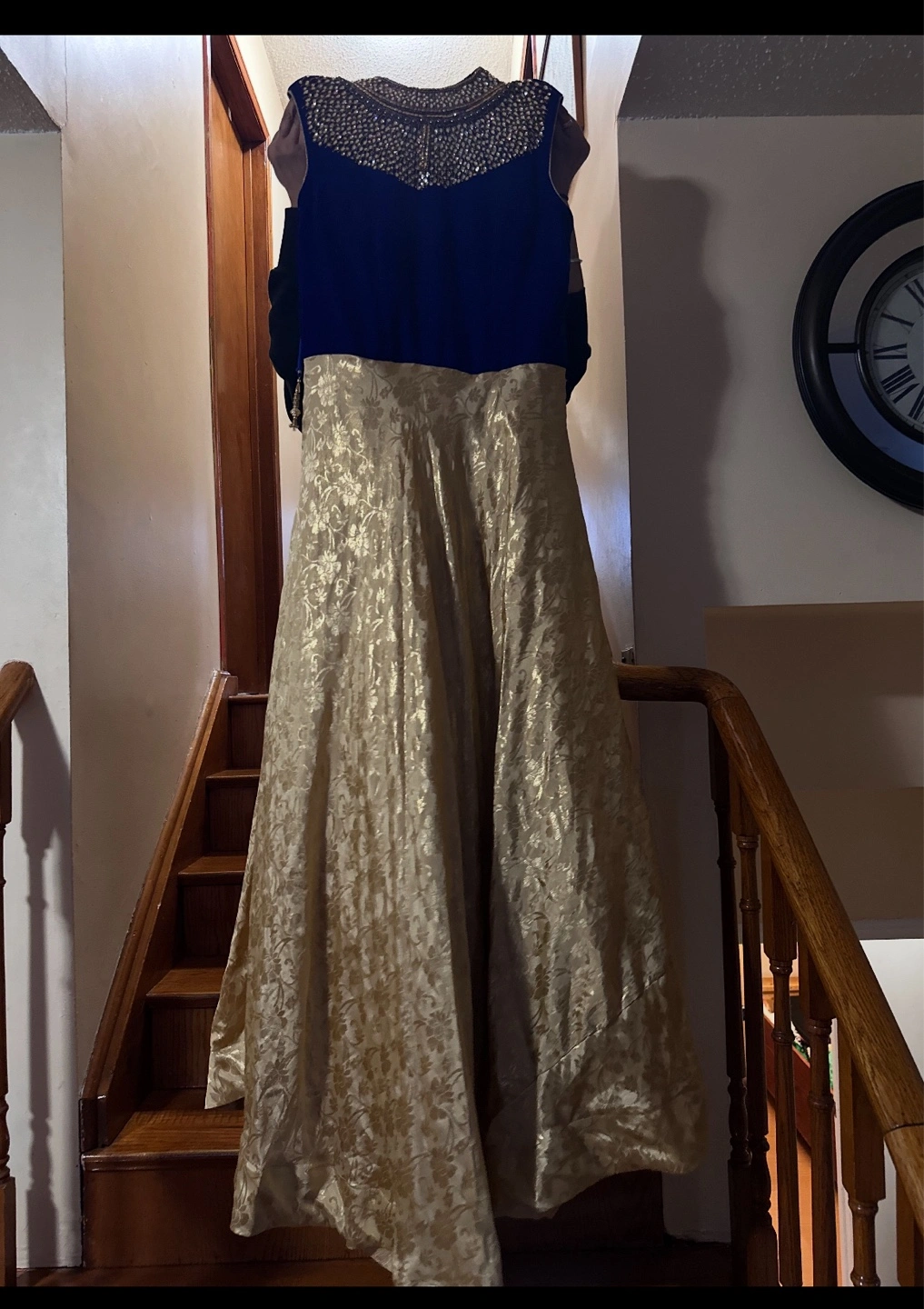 Beautiful floor-length gown. Blue velvet bodice, gold brocade skirt. Intricate embellishments at neckline. Sleeveless. Perfect for special occasions.