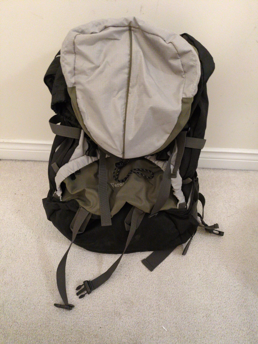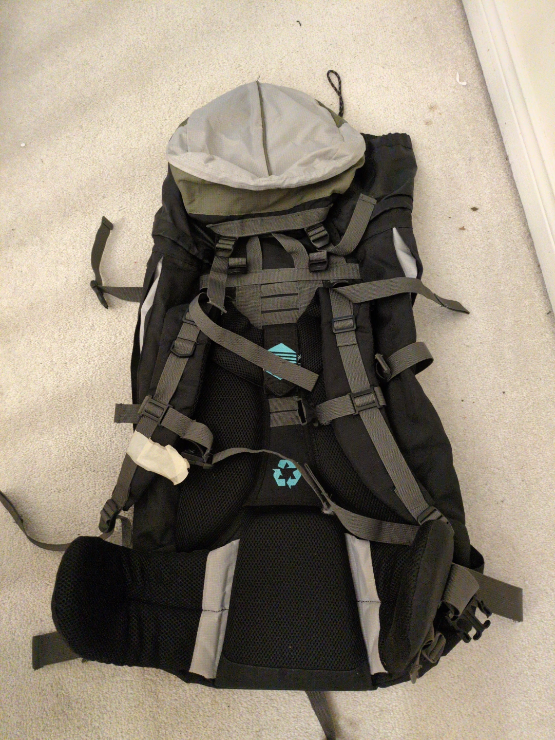 Large backpacking pack. Grey, black, and green colour scheme. Multiple straps and compartments. Good for hiking and camping.
