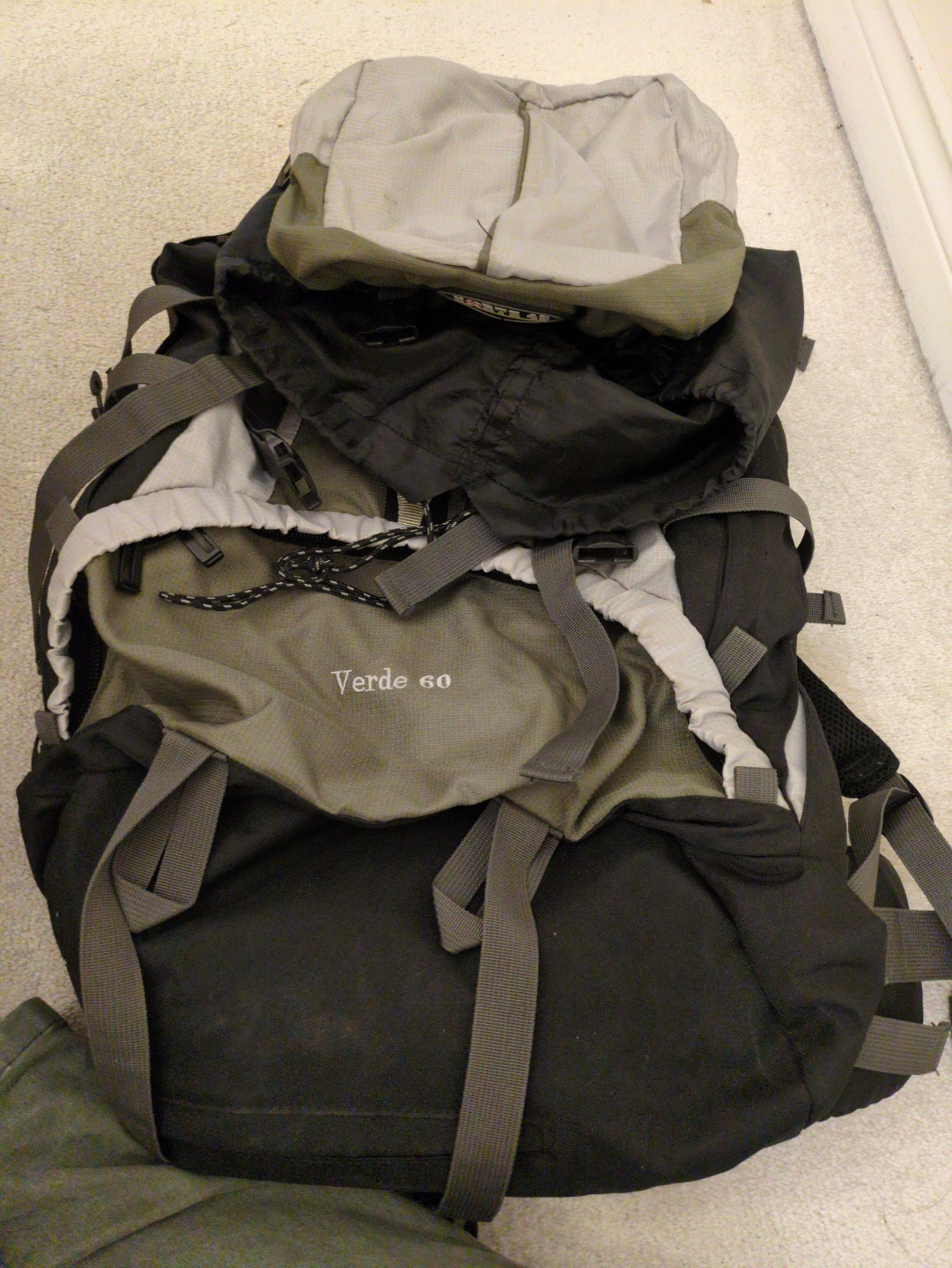Large backpacking pack. Grey, black, and green colour scheme. Multiple straps and compartments. Good for hiking and camping.