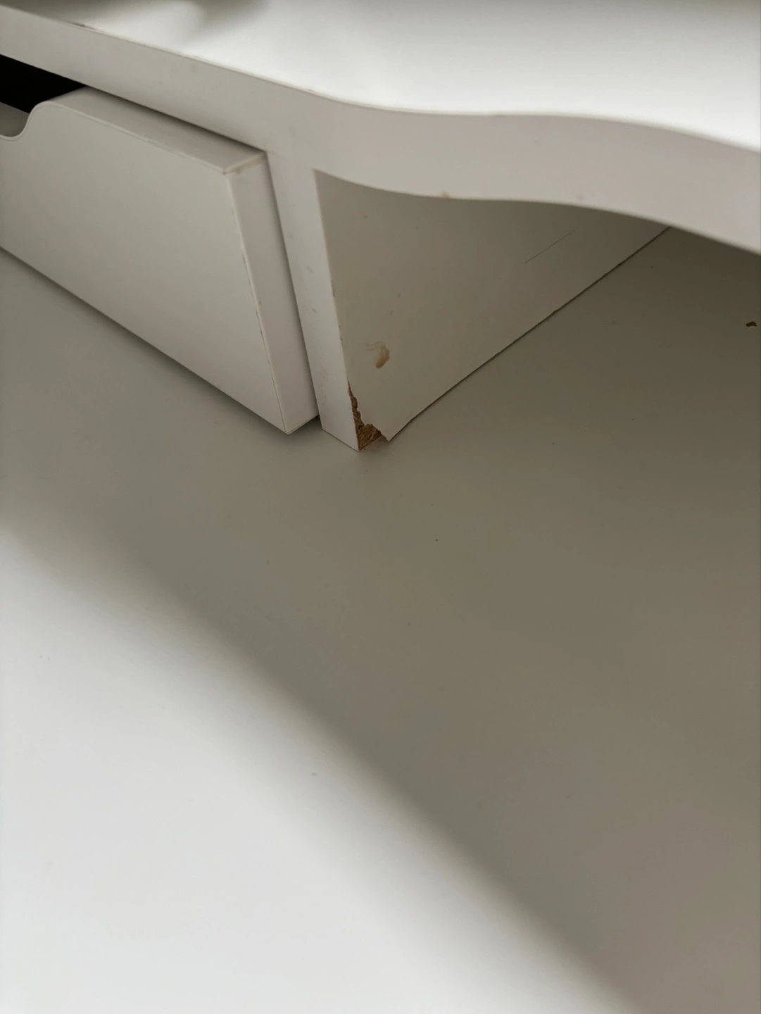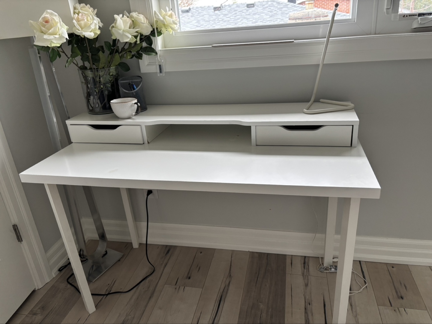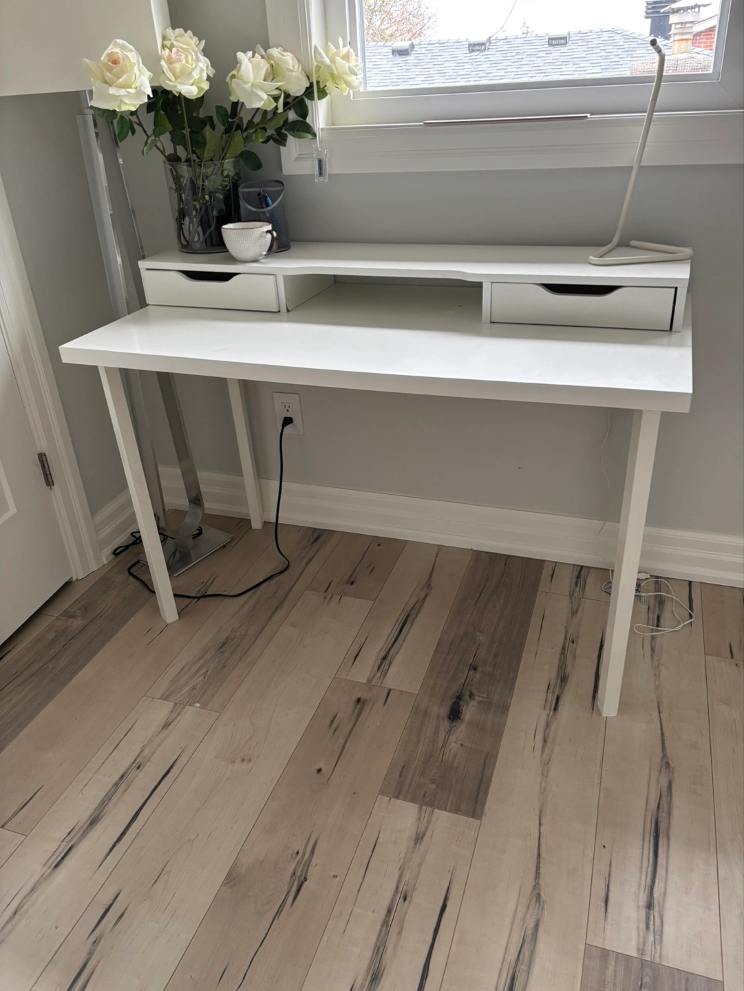 Small white desk. Two drawers. Simple design. Minimalist style. Good for small spaces.It has two scratches which you can see in the photos but it is still in a good condition .