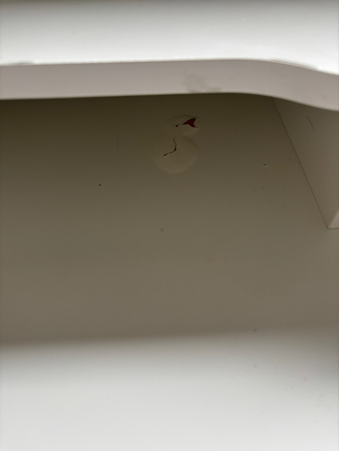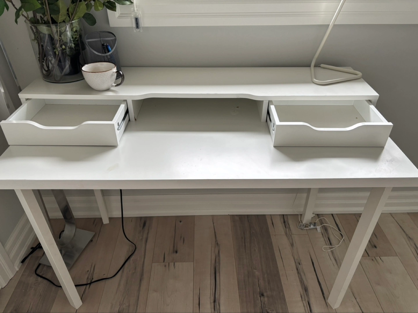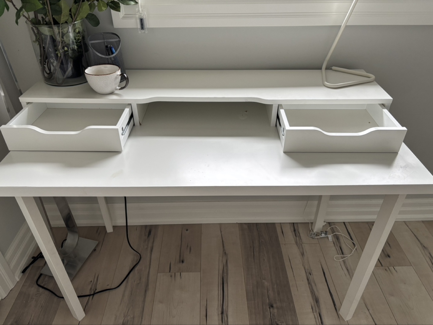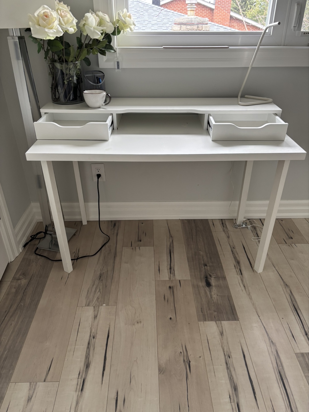 Small white desk. Two drawers. Simple design. Minimalist style. Good for small spaces.It has two scratches which you can see in the photos but it is still in a good condition .