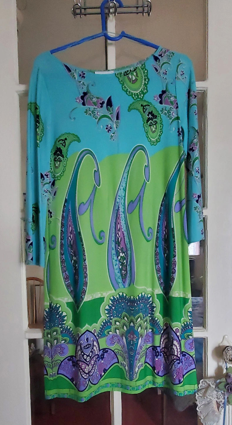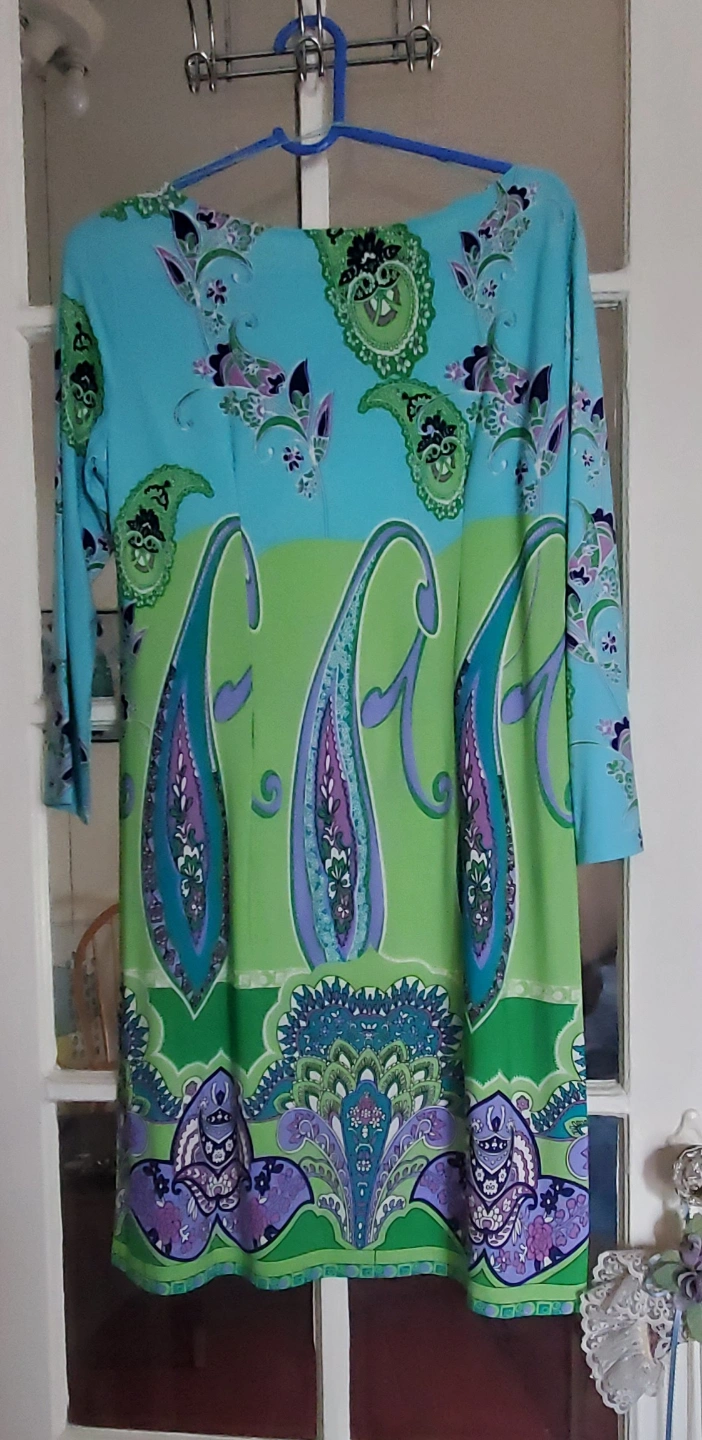 243Beautiful, vibrant colorful dress. Lightweight comfortable material - 95% polyester / 5% spandex. Boat neck, three quarter sleeves. Relaxed fit. Perfect for spring and summer.
