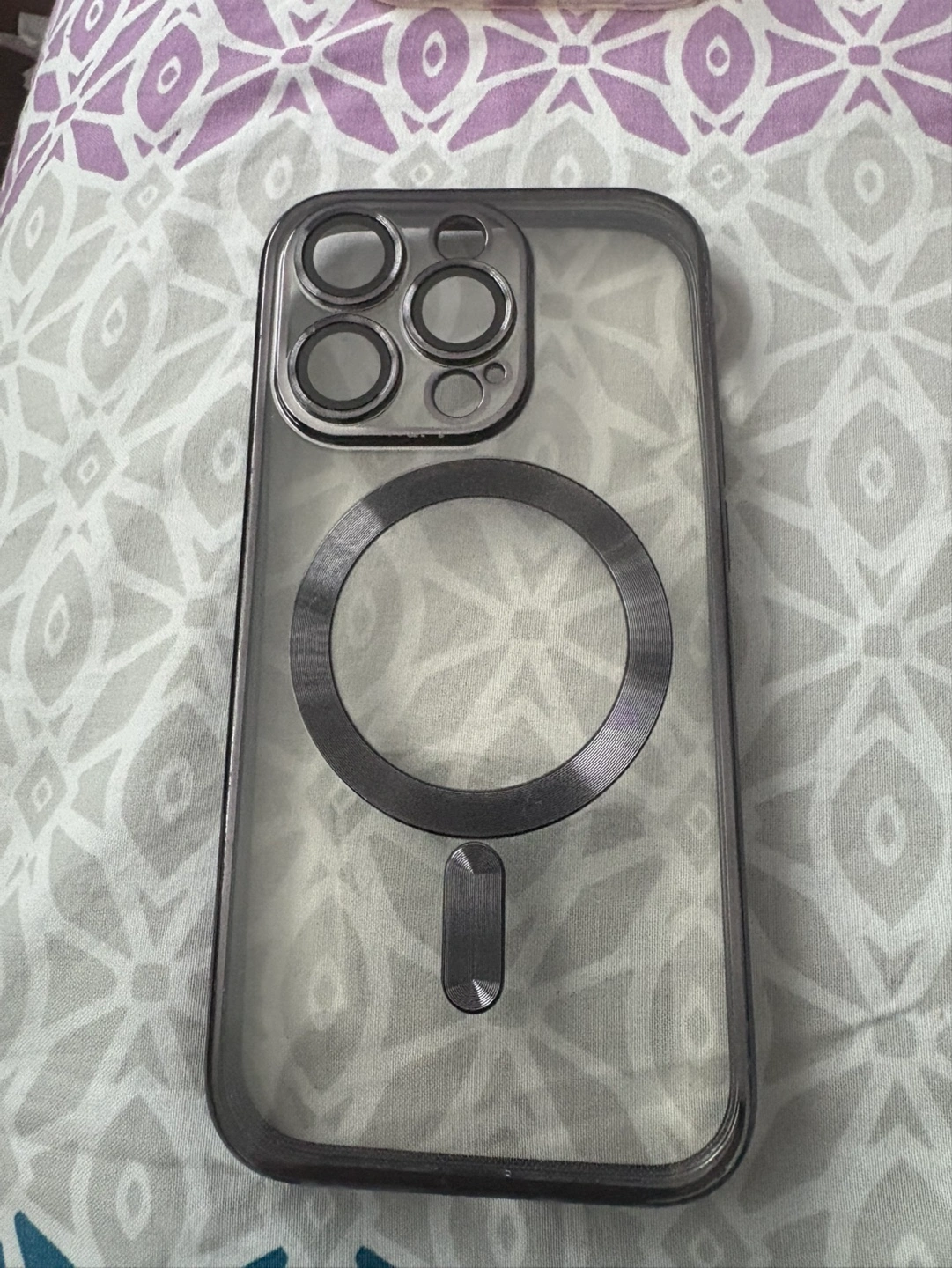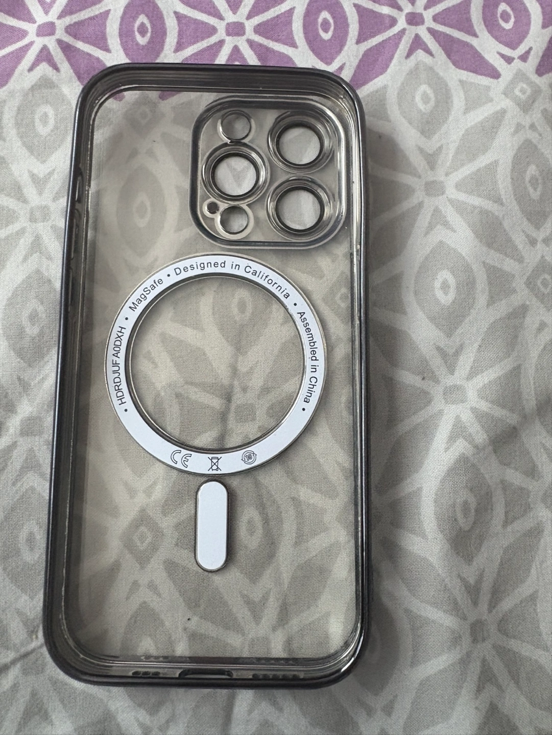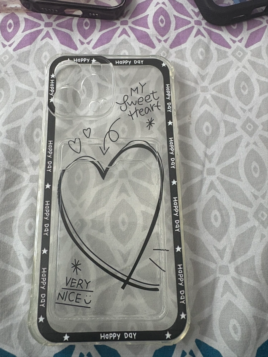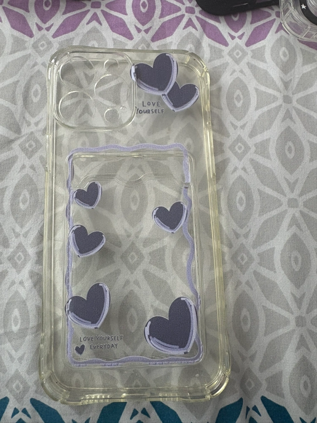 282Four clear phone cases for iPhone 13 Pro Max. One case features a MagSafe ring. Two cases have cute heart designs. One case has a card holder. All are in good condition.
