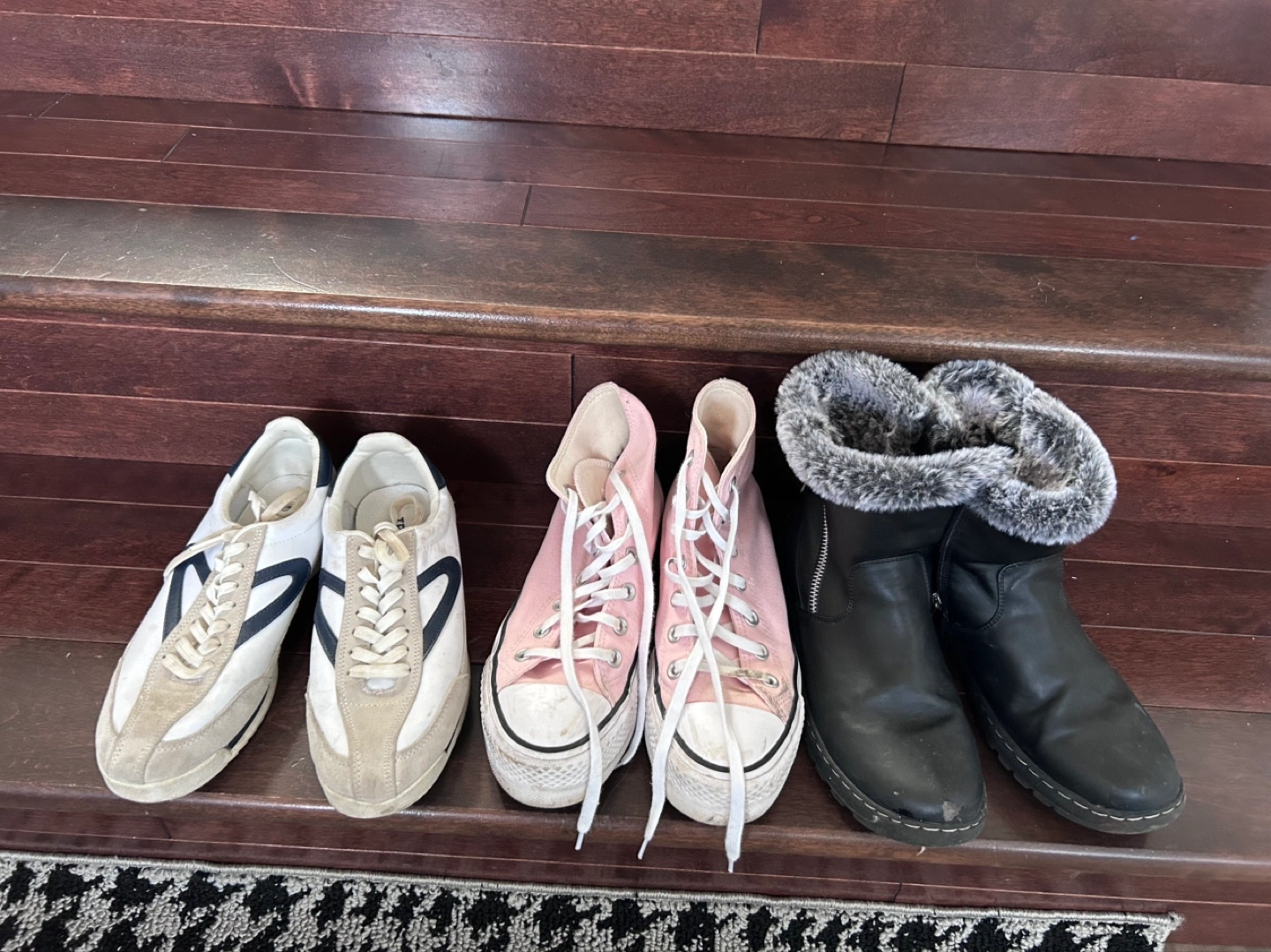 Bundle of three pairs of women's shoes. Includes a pair of pink Converse high-tops, a pair of low-top sneakers, and a pair of black ankle boots with faux fur trim. Pre-owned, some wear.