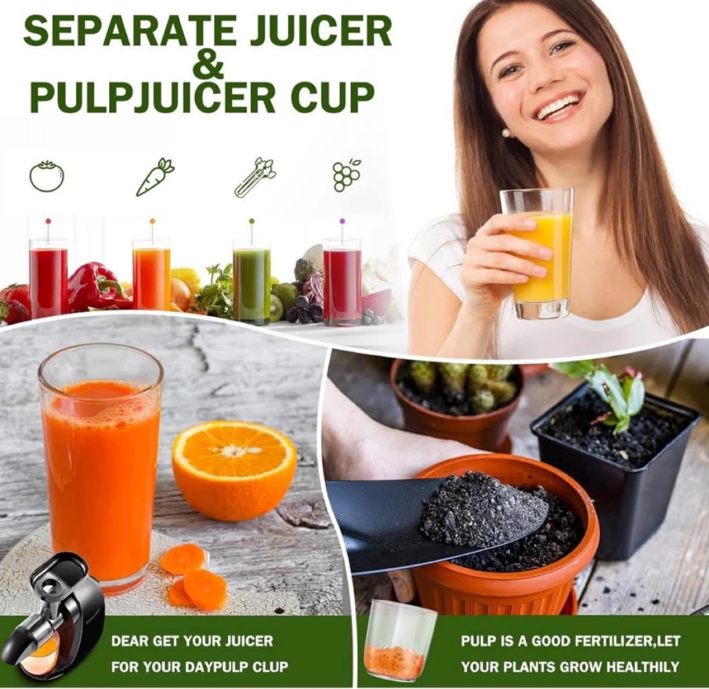 Juicer with pulp cup. Makes juice and drier pulp. Upgraded filter extracts purest juice. High rate of juice, screw extrusion. Great for plants.