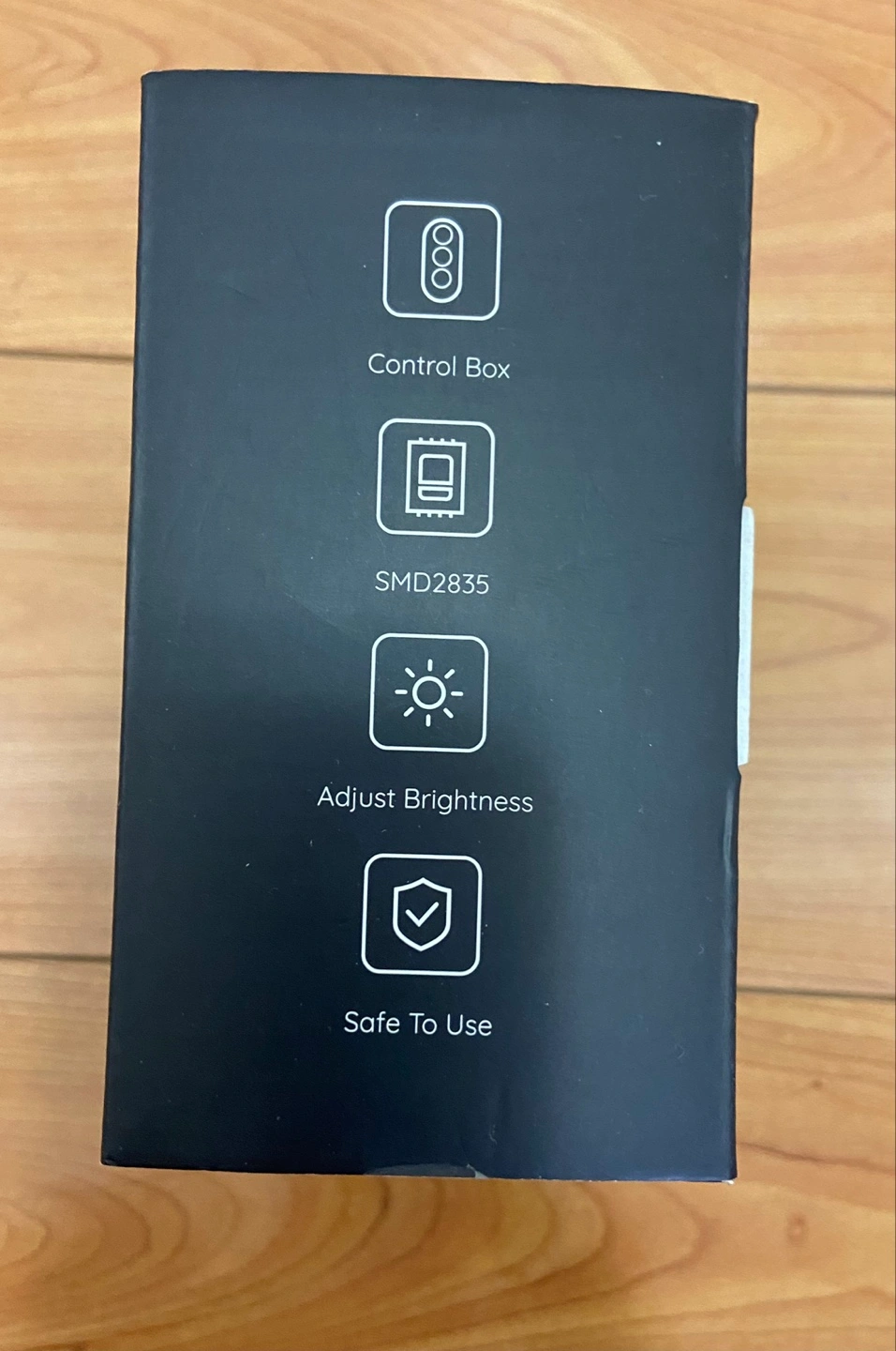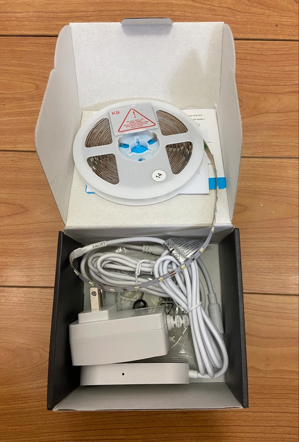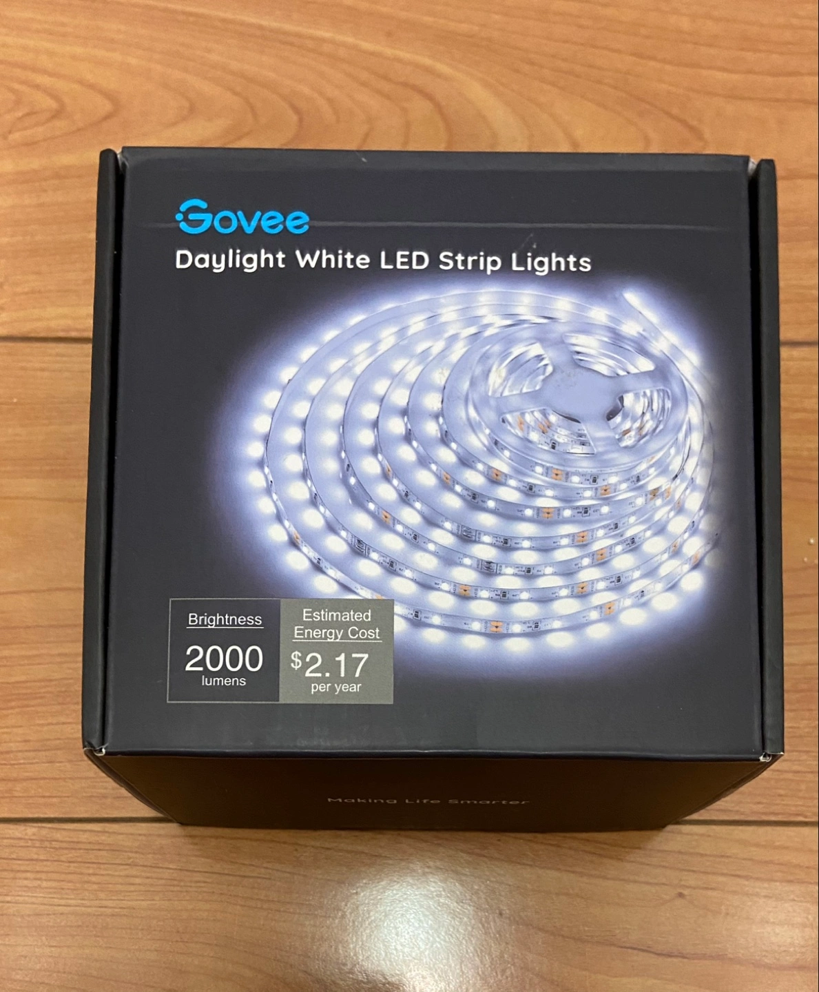 New Govee LED strip lights. Daylight white. 2000 lumens. Includes control box, power adapter, and instructions. Brightness adjustable. Safe to use.