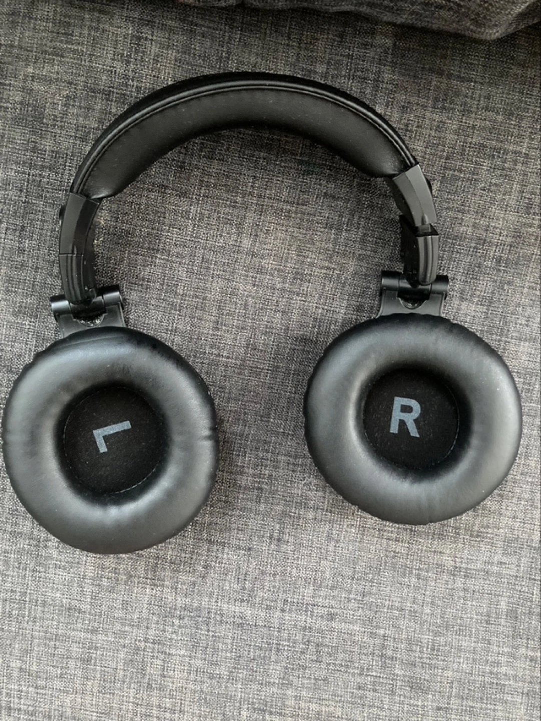 Black over-ear headphones. Comfortable fit. Includes pink coiled cable. Wired headphones, great for listening to music, DJing, podcasts, etc..