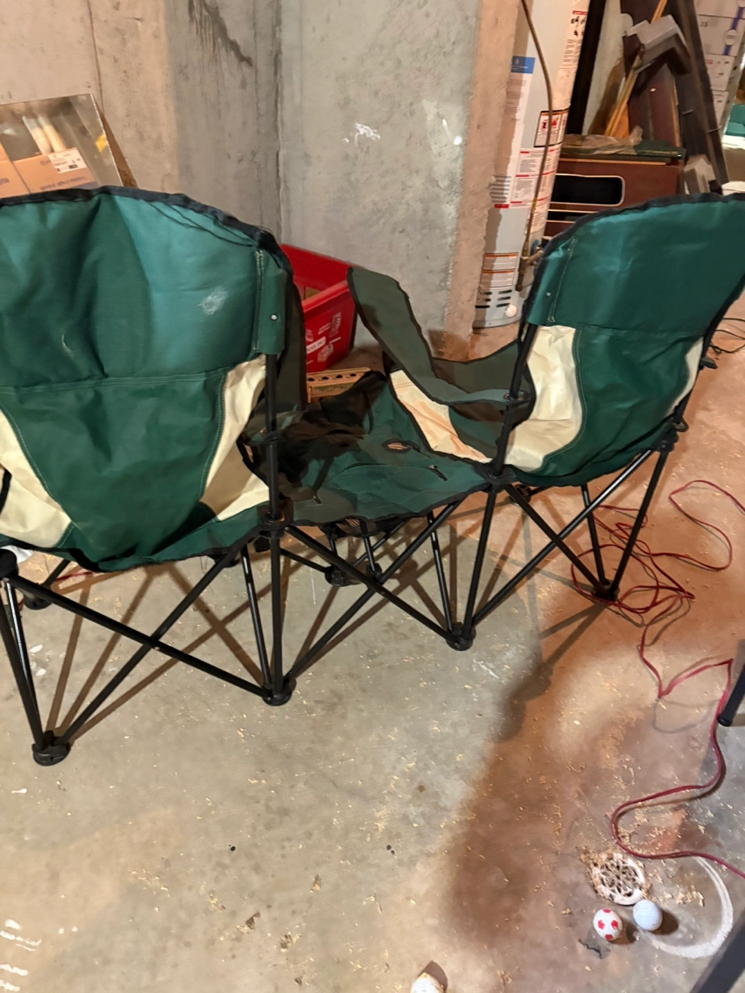 Double foldable camping chair. Features a built-in cooler between seats. Green and beige fabric. Metal frame. Great for camping and outdoor events!
