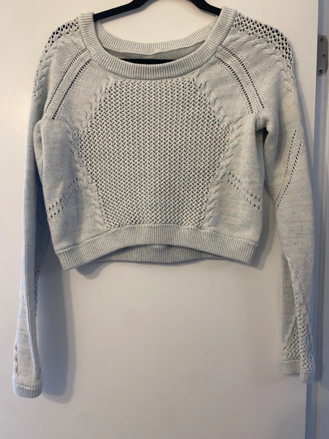 Light blue knit cropped sweater, size 8. Long sleeves, round neckline. Intricate knit pattern. Washed and wears really well. Good condition. Please refer to pictures for more details of knit pattern and condition.