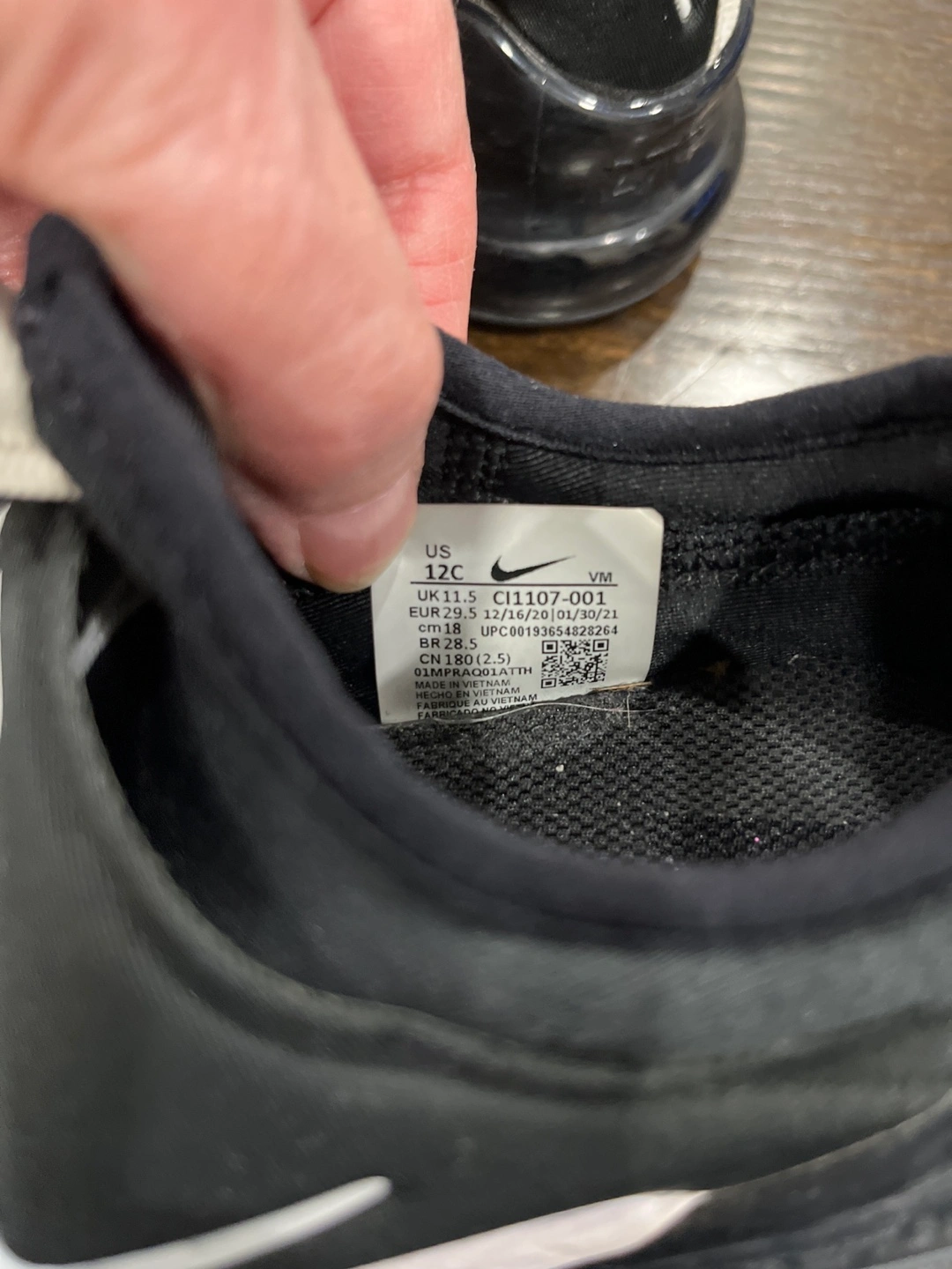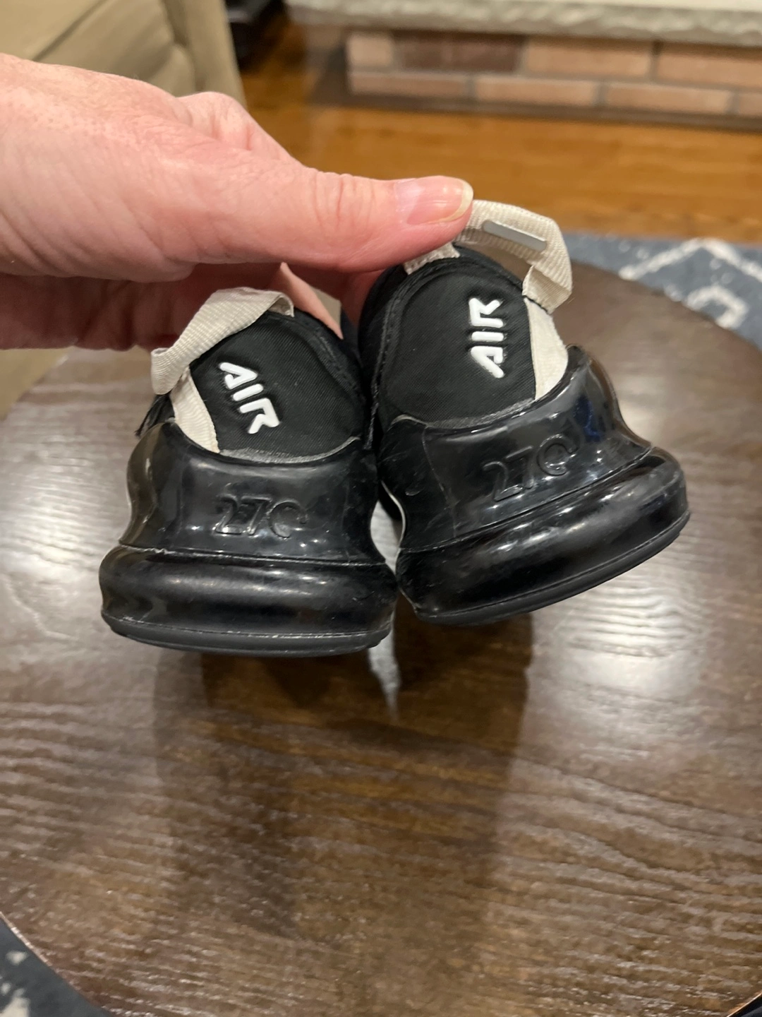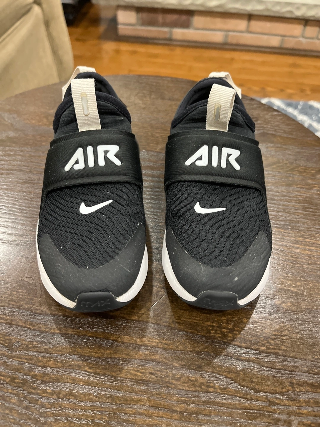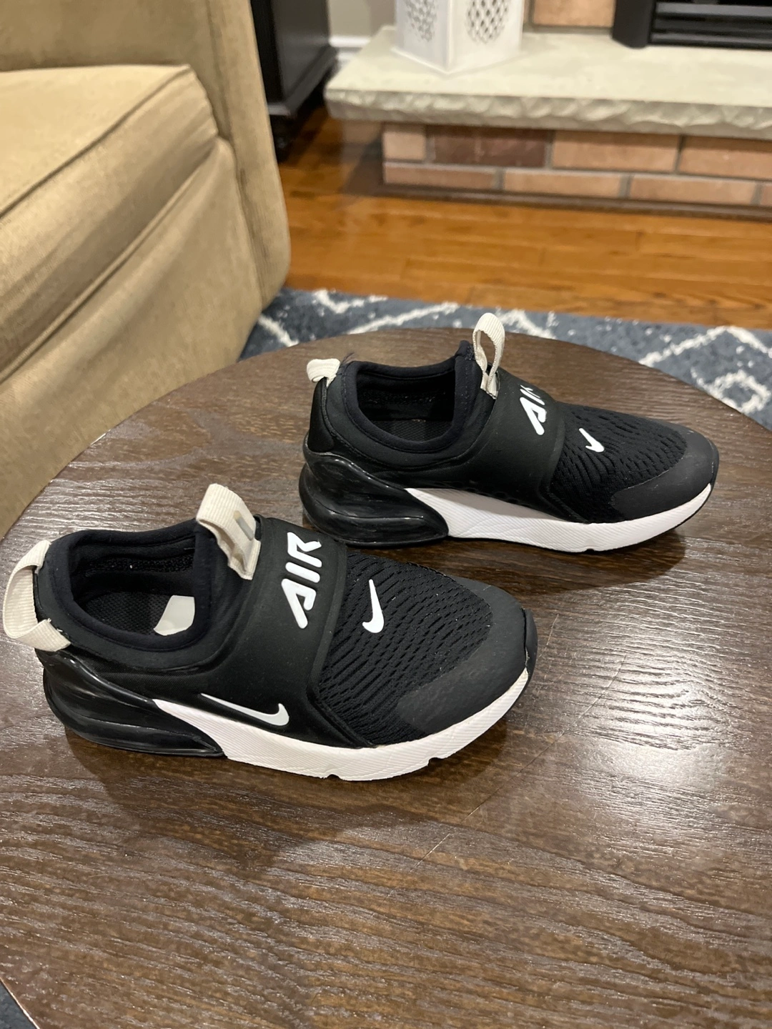 Black and white toddler slip-on Nike Air Max 270 shoes. Size 12C. Pre-owned, good condition.Used for indoor shoes. Paid $120