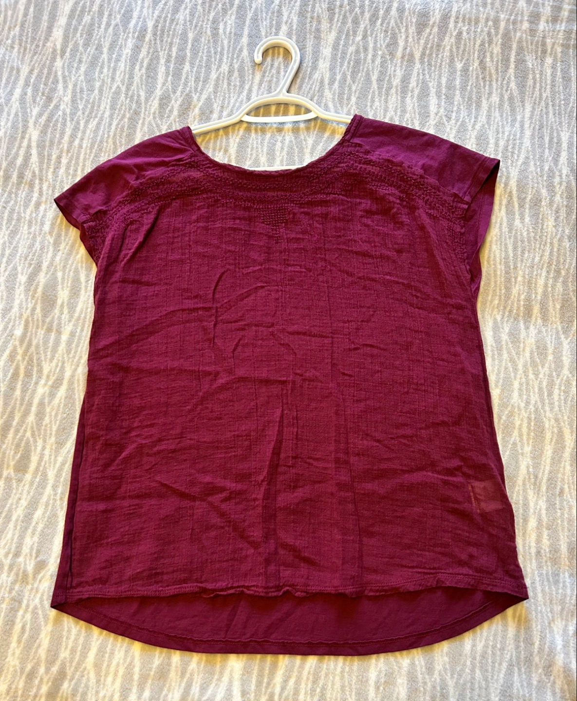 Maroon women's top. Fits like a S. Short sleeves. Embroidered detail neckline. 100% cotton. Made in India. Very lightweight and comfortable 😊