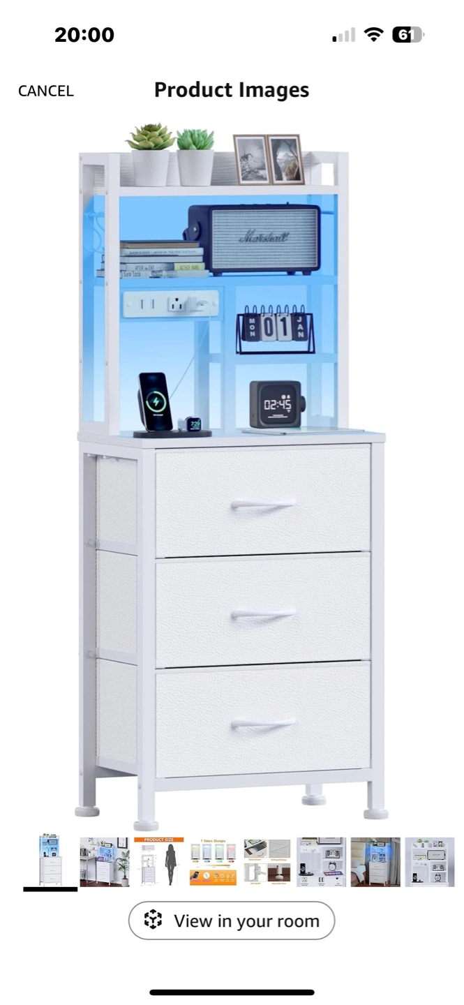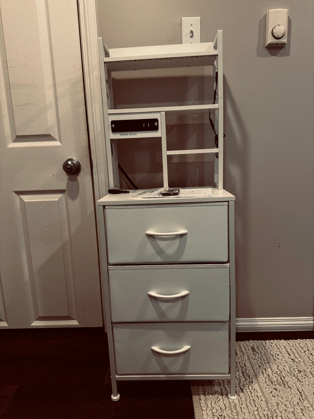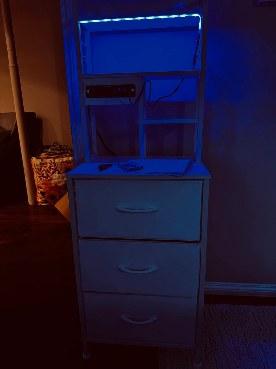 White nightstand. Three drawers. Three shelves. LED lights. USB ports and outlets. Great for bedroom, dorm, or office.