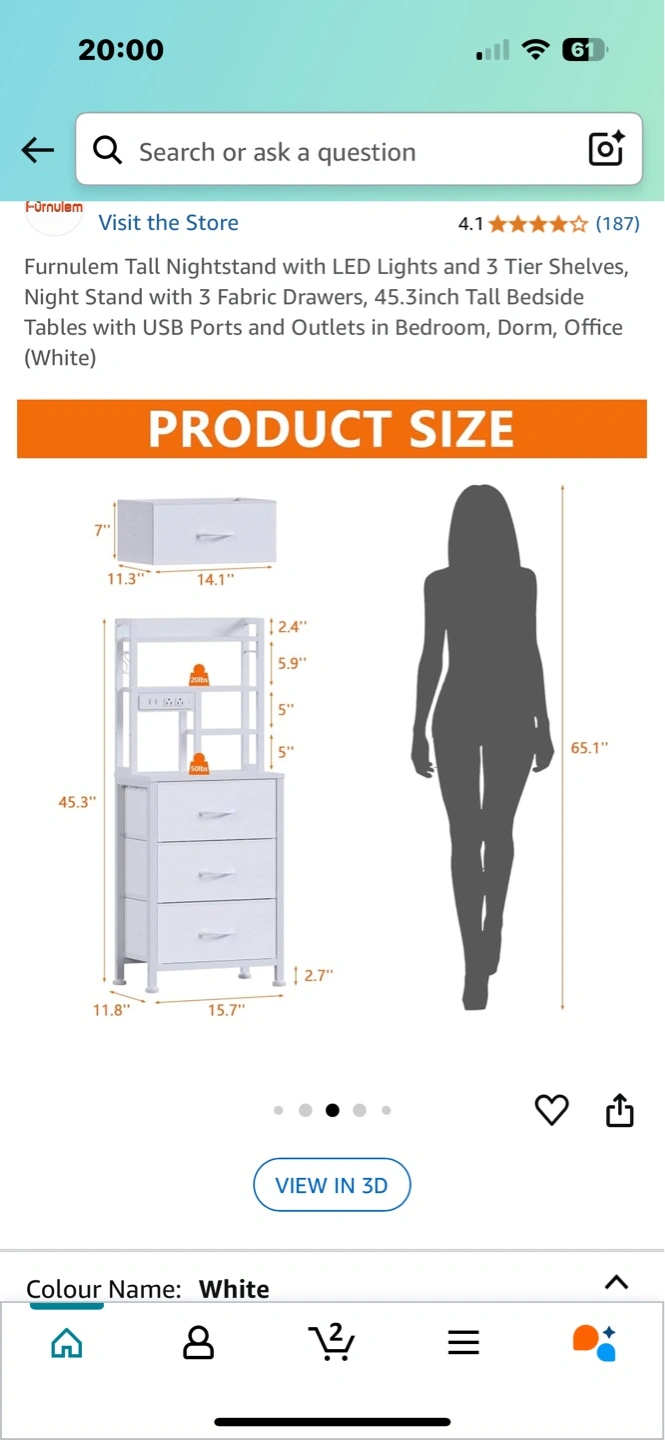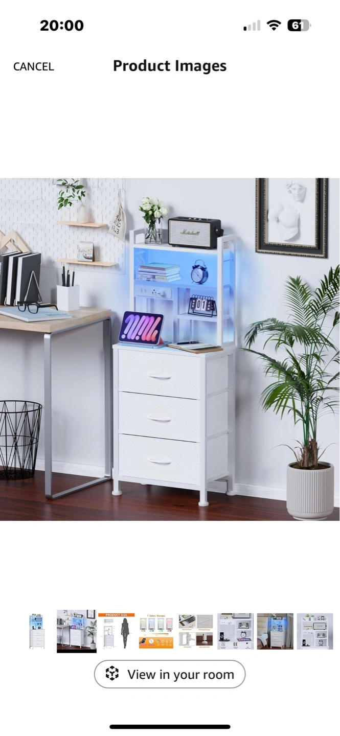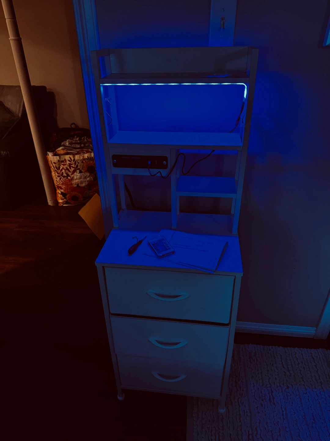 White nightstand. Three drawers. Three shelves. LED lights. USB ports and outlets. Great for bedroom, dorm, or office.
