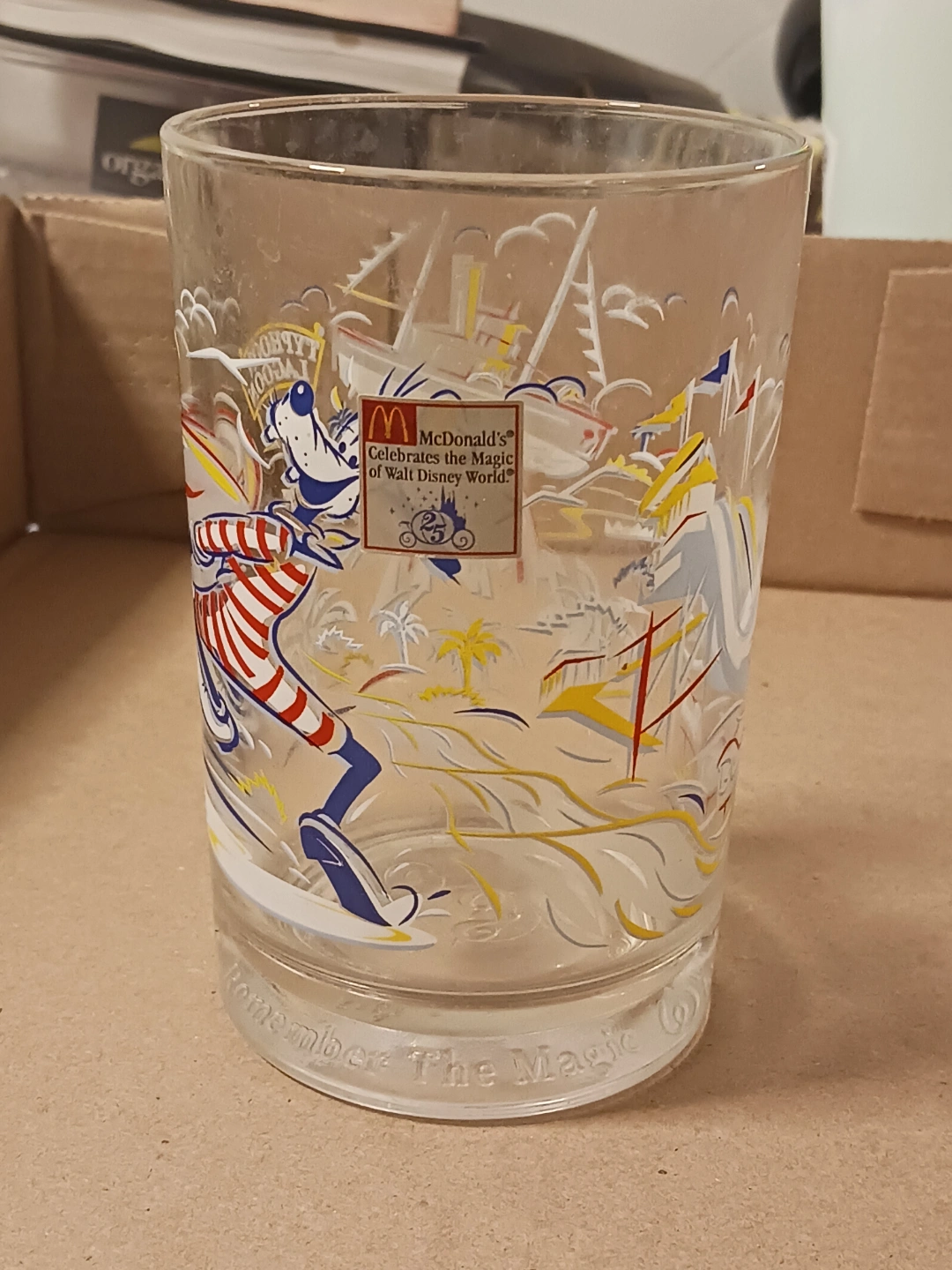 Clear glass featuring Goofy and various Walt Disney World attractions. McDonald's Celebrates the Magic of Walt Disney World branding. Collectible souvenir glass.