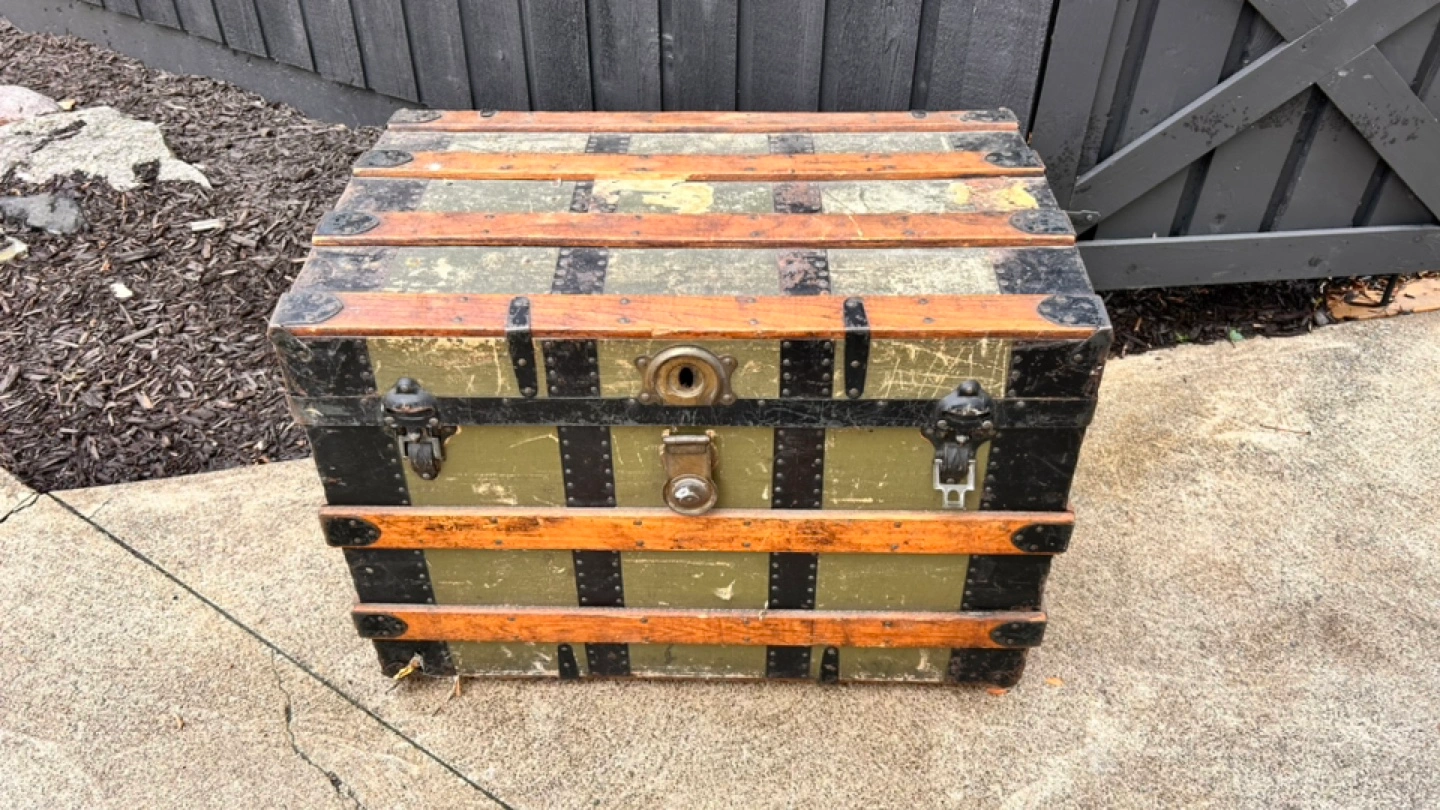 Antique trunk, great storage. Shows wear consistent with age. Metal hardware. Wooden slats. Interior shows wear.