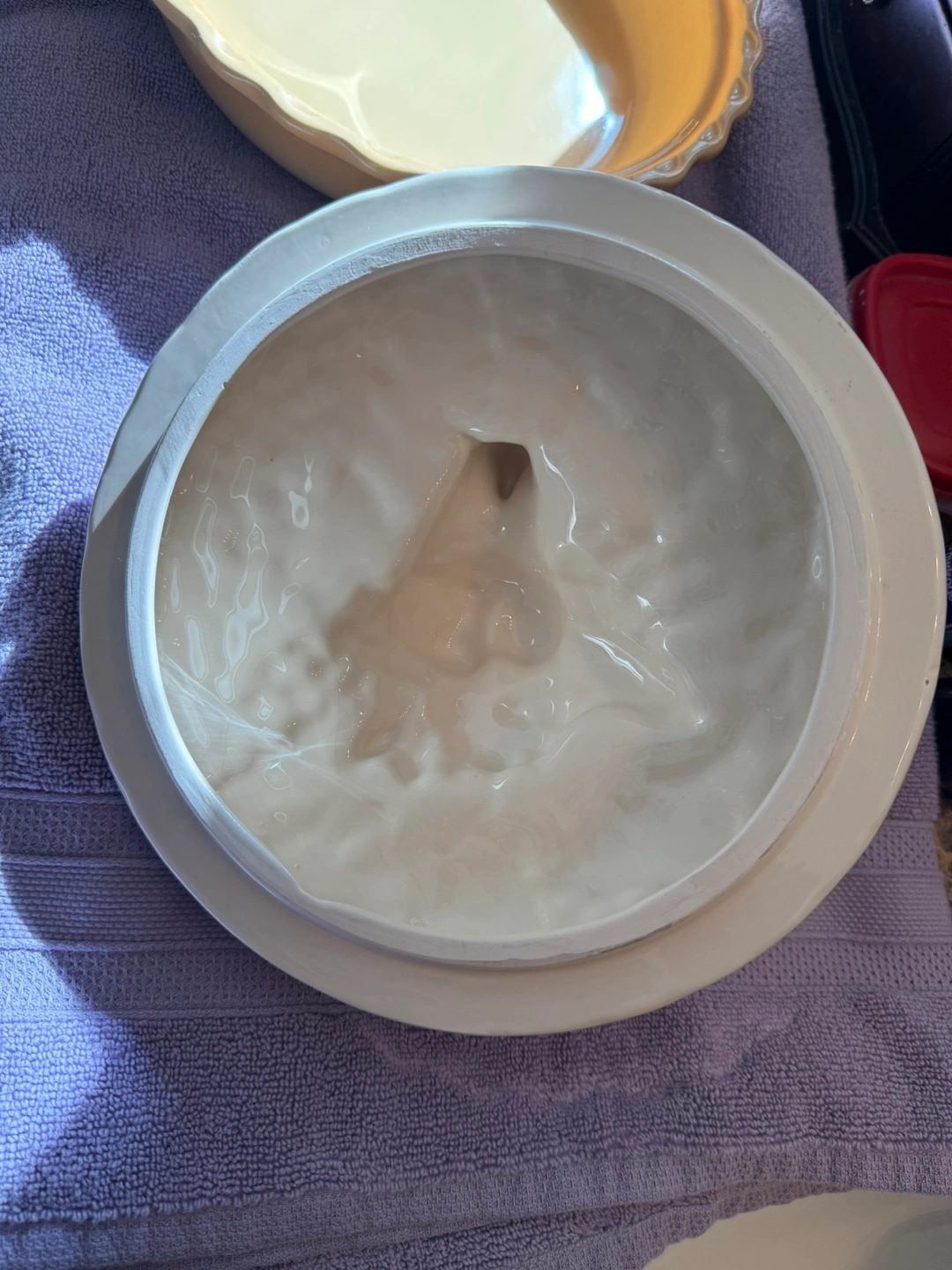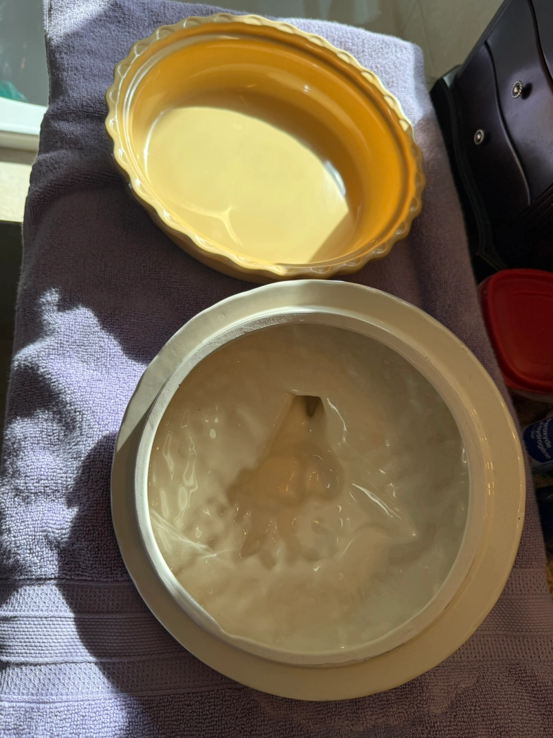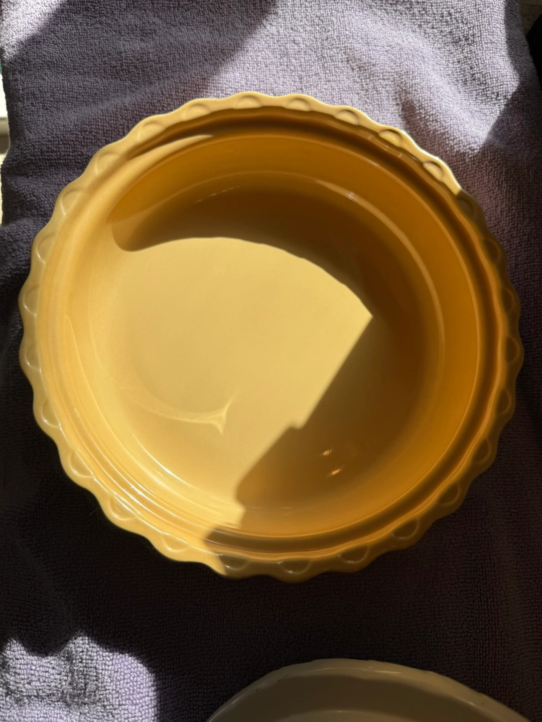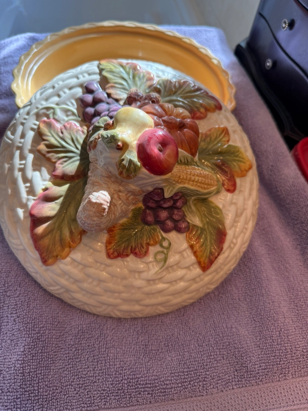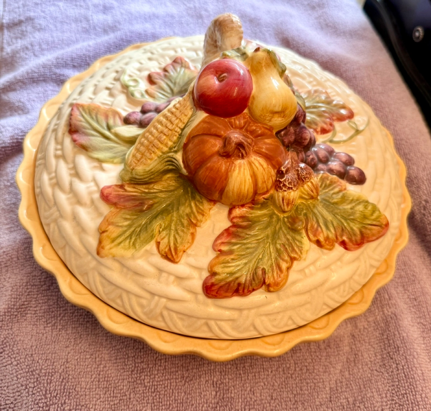 Beautiful pie carrier. Features autumn harvest design. Cream and yellow colours. Lid and base included. It’s been sitting in a cupboard for a while and never been used. Oven safe
