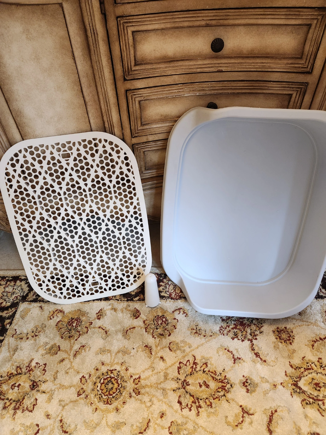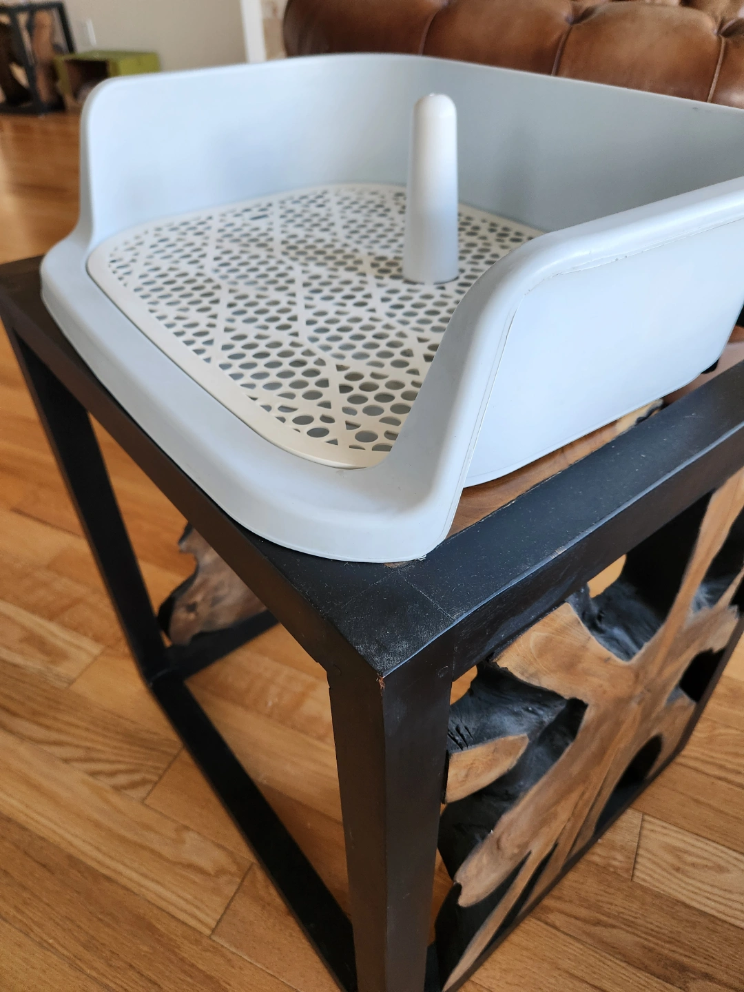 New potty training system. Includes a plastic tray with a perforated insert and a small removable post. Easy to clean. Perfect for dogs (males ) to use the toilet. If you have a female dog , just remove the post. Large size.