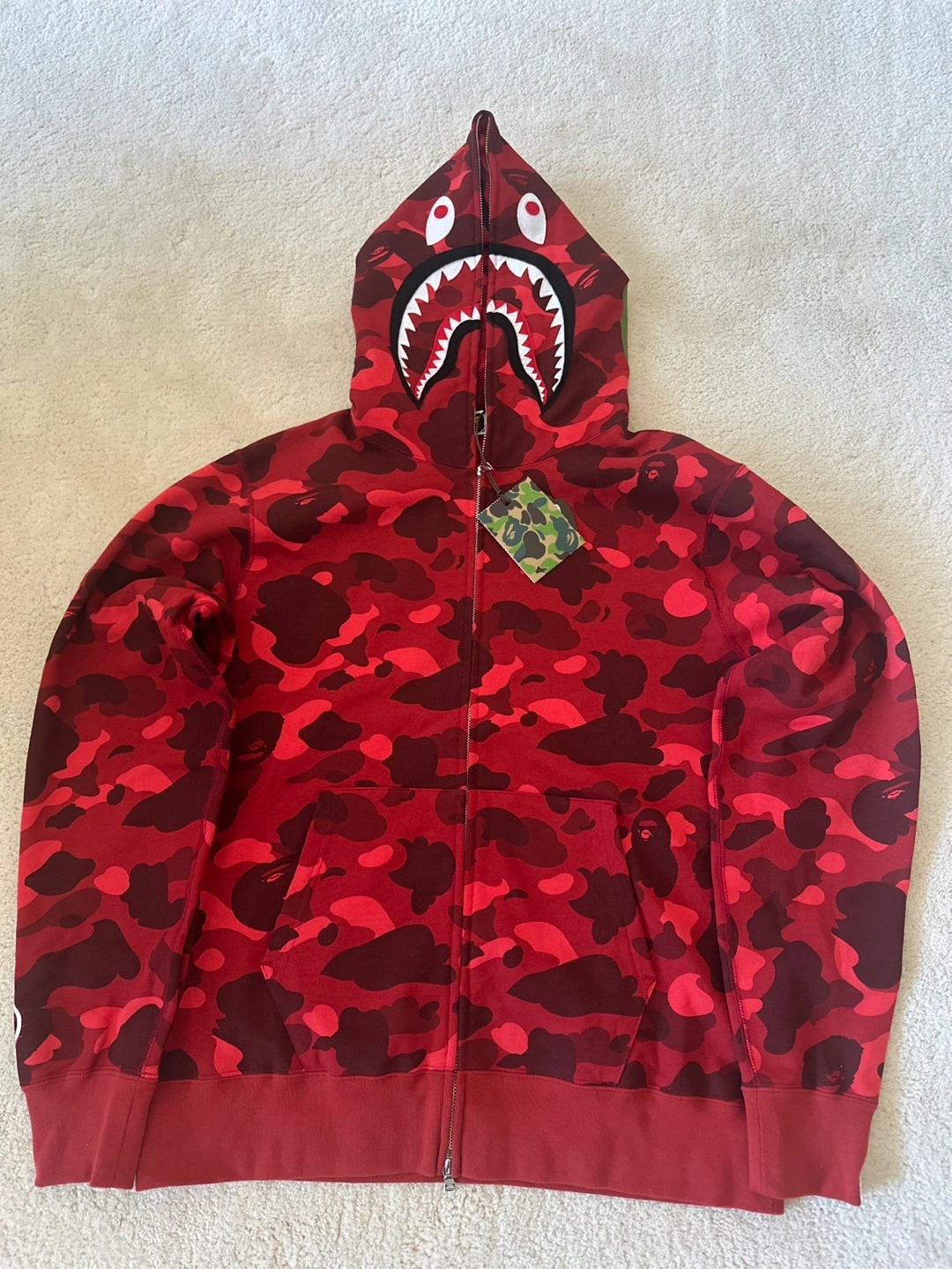 Men's BAPE Shark Full Zip Hoodie. Red camo pattern. 100% cotton. Made in Japan. Features iconic shark head design. With tags.