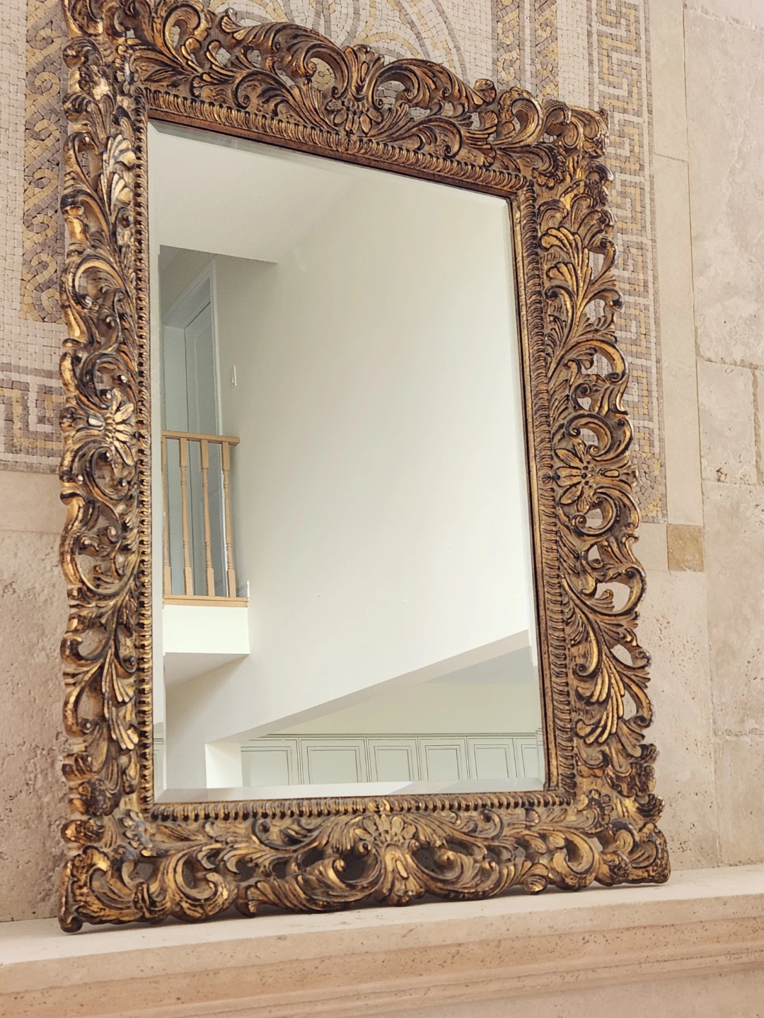 31Beautiful Large, ornately framed mirror. 45"x33".Gold finish. Rectangular shape. Intricate detailing on the frame. Beautiful statement piece for any room. Paid 900.