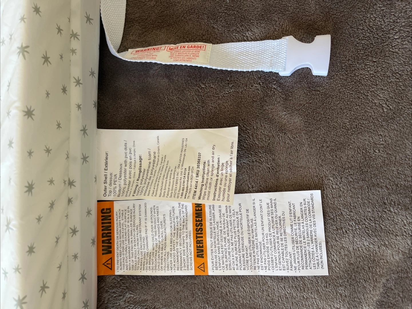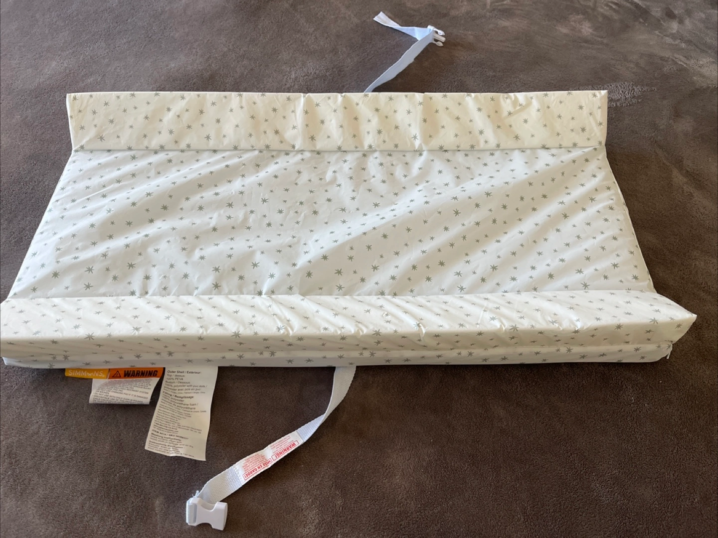 Soft changing pad, convenient for travel. Features a padded surface and straps for secure fastening. Grey stars on a white background. Machine washable.