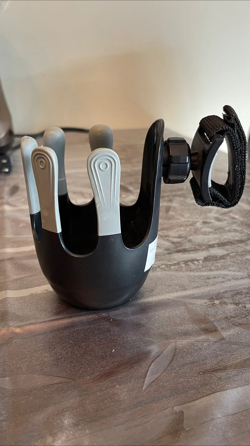 Universal stroller cup holder. Attaches easily. Holds most standard sized cups and bottles. Great for keeping your drinks close at hand.