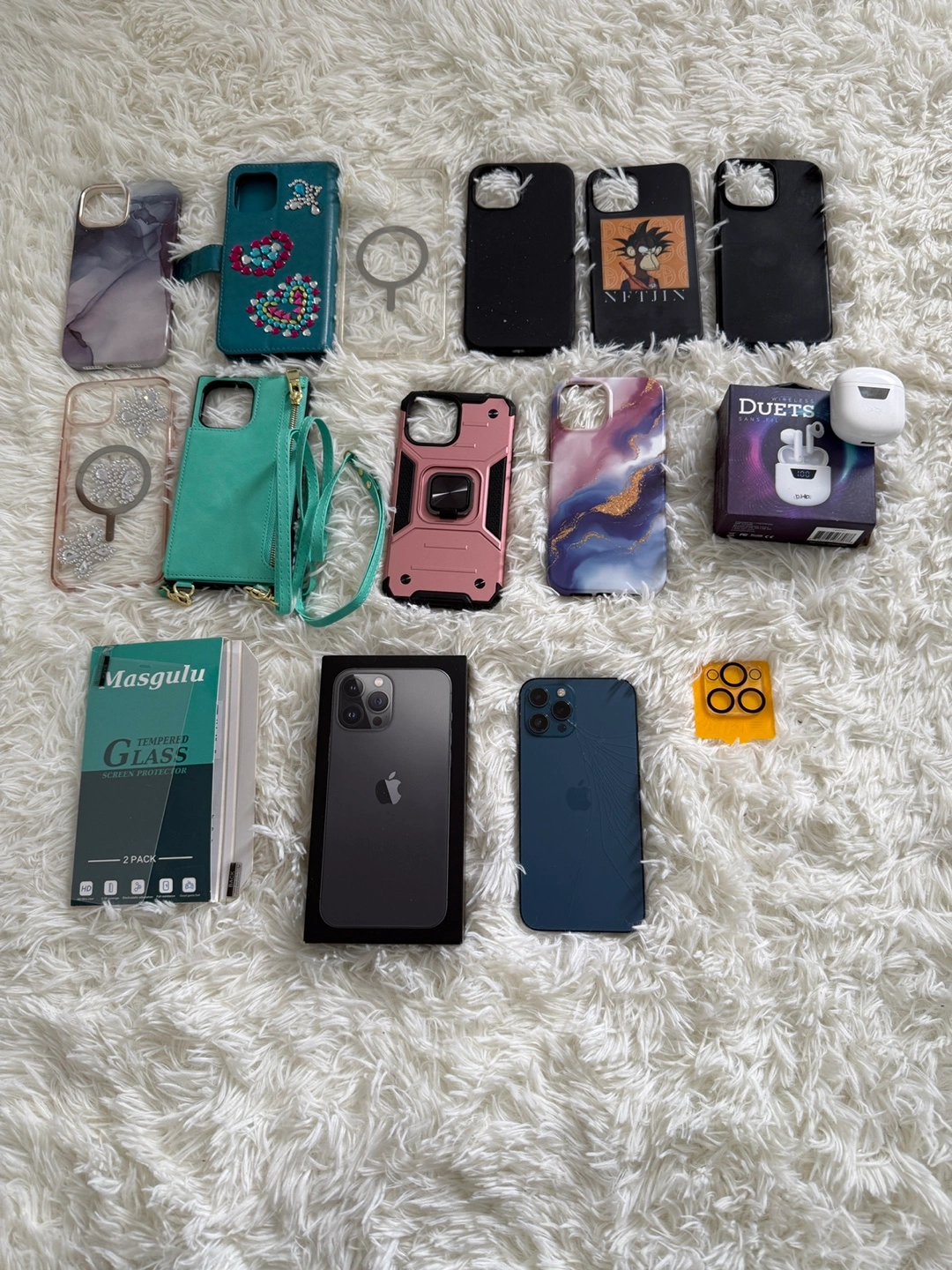 Variety of iPhone 10 cases, including wallet cases, protective cases, and screen protectors. Also includes wireless earbuds and phone lens.