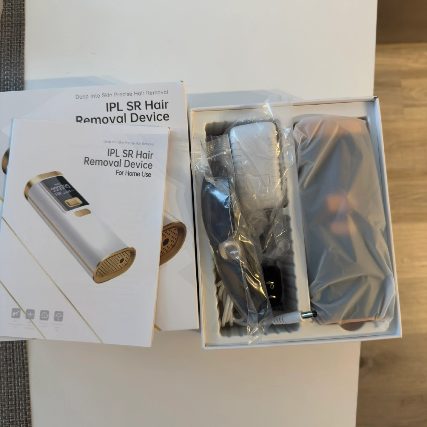 Home use IPL hair removal device. Includes device, power cord, additional attachments and instructions. Three energy levels. Never used.