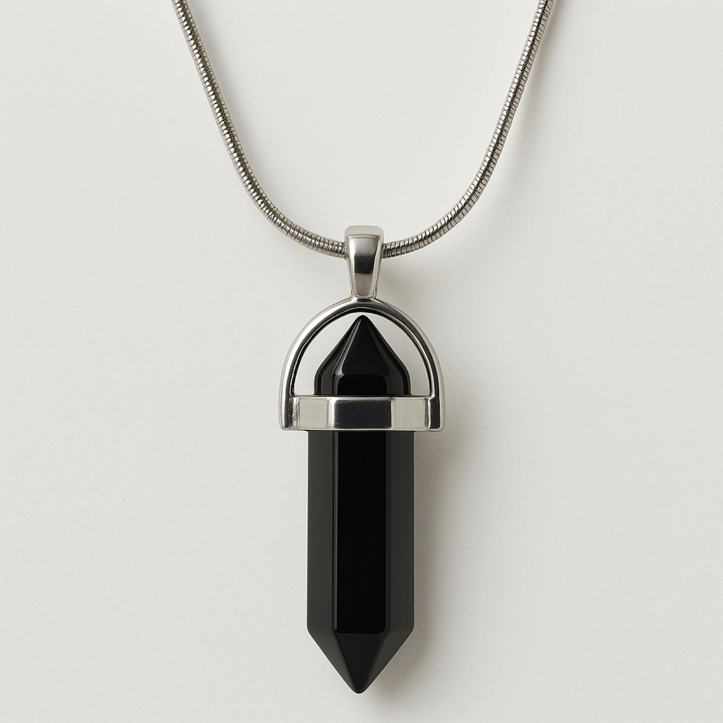 Elegant black onyx point pendant necklace. Features a silver-toned chain and metal setting. Simple design, perfect for everyday wear.