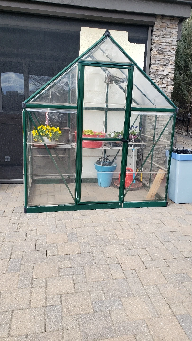 Small greenhouse, great for starting seeds or protecting plants. Green metal frame, clear plastic panels. Includes shelving.Can be partially dismantled for removal.Your truck would be required to remove.Contents NOT Included.Available Southwest Area.Kept outdoors all year round