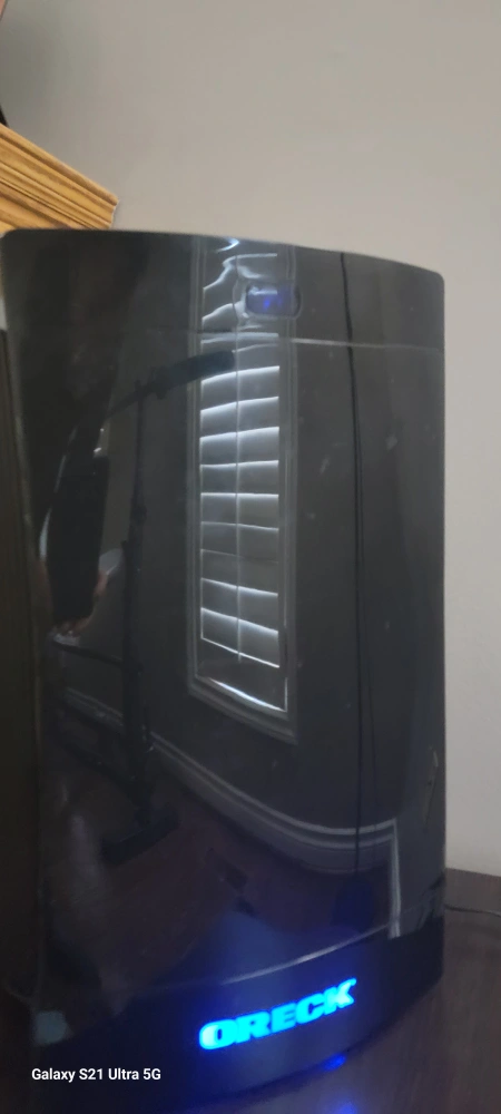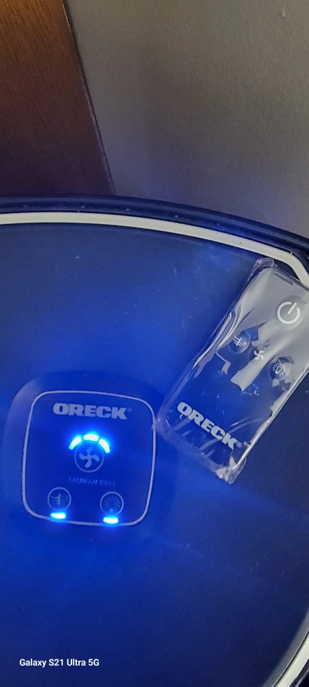Sleek black air purifier. Includes remote control. Features a Truman Cell filter. Good condition.