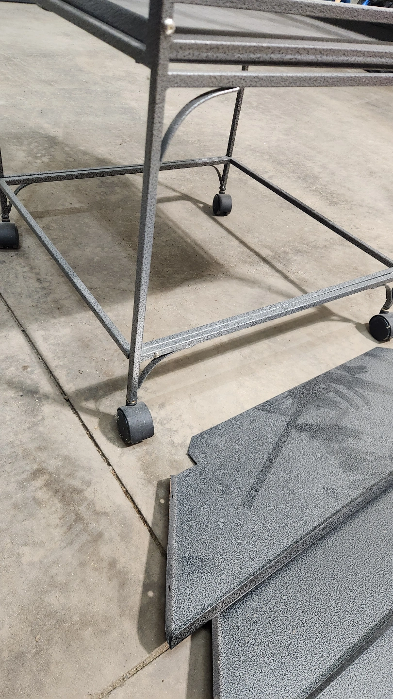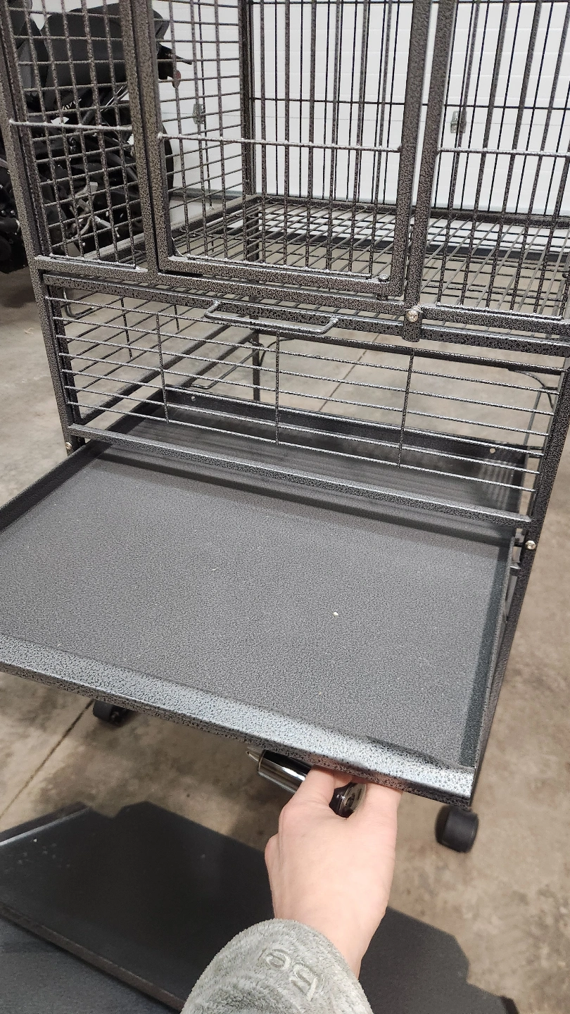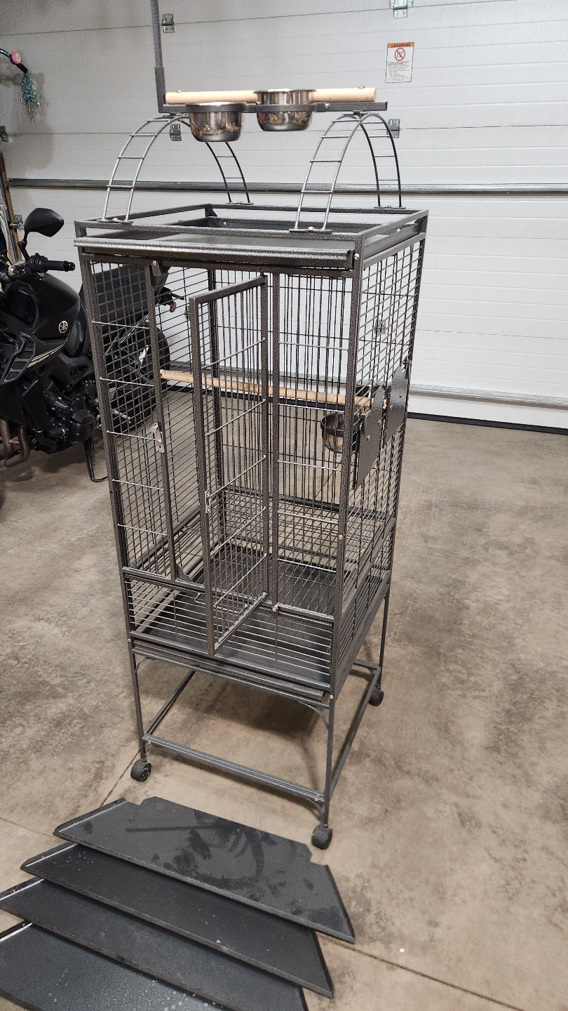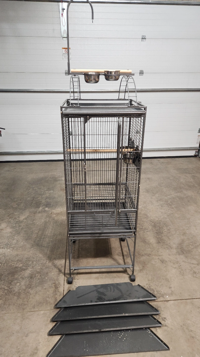 Spacious metal bird cage. Features a stand with wheels, two food bowls, and a perch.