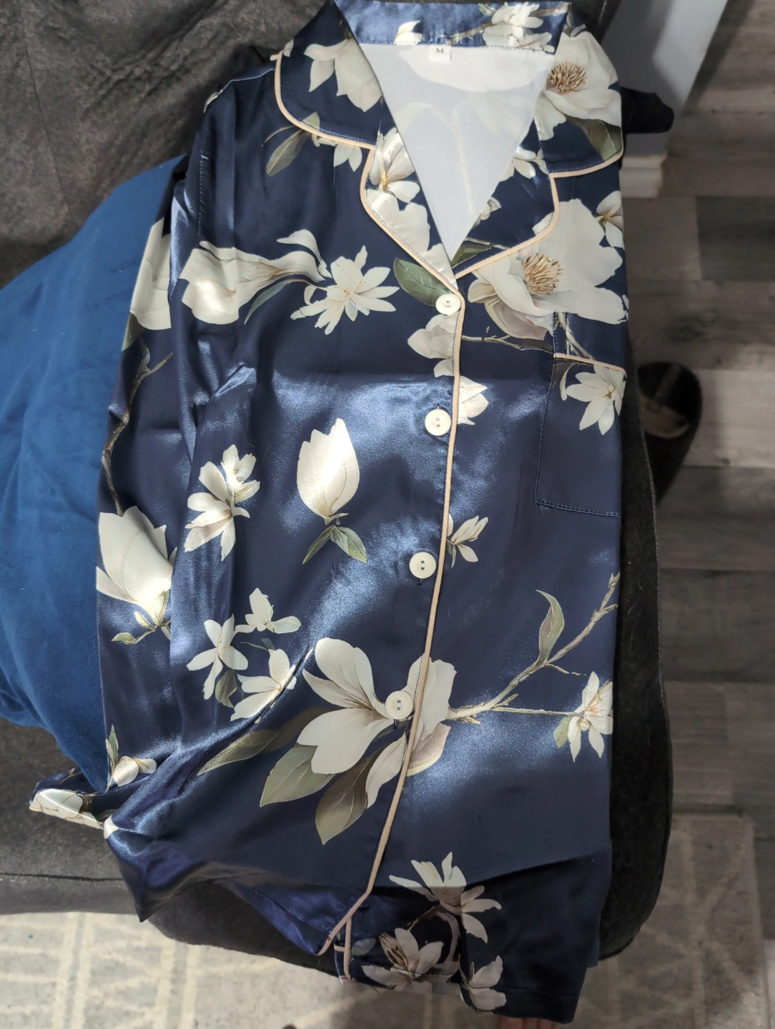32Beautiful navy blue satin pajama set. Features a floral print throughout. Long sleeves, collared shirt, and matching pants. Size Medium.