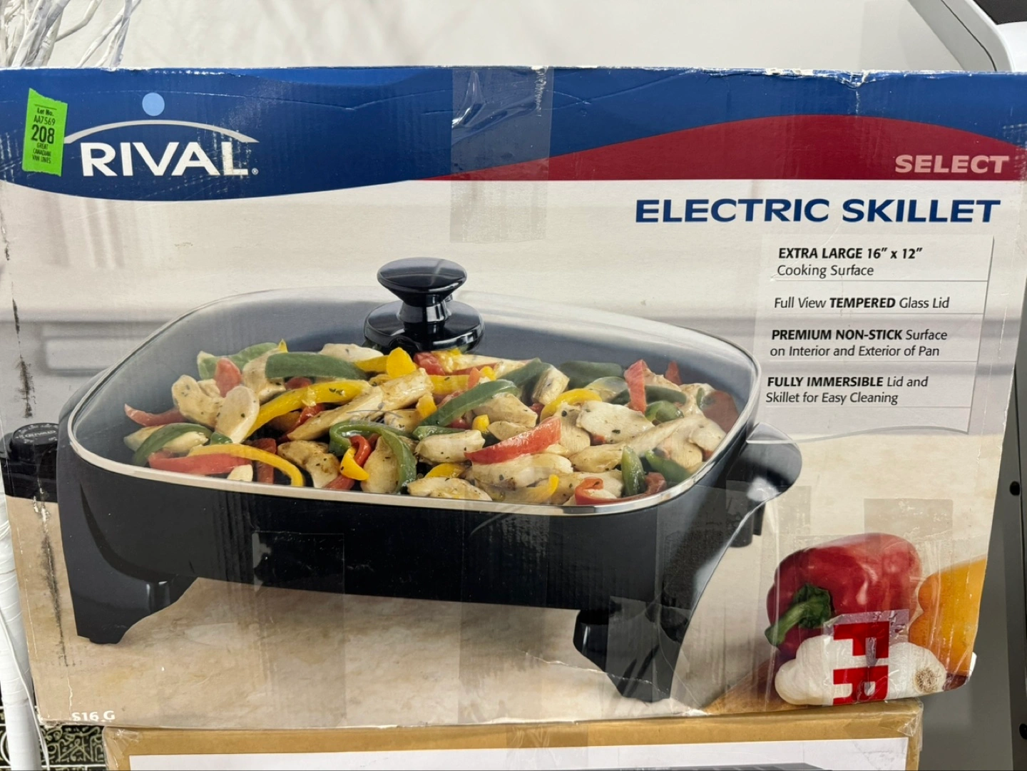 Brand new Rival Select electric skillet. Large 16" x 12" cooking surface. Premium non-stick surface. Full view tempered glass lid. Fully immersible for easy cleaning.