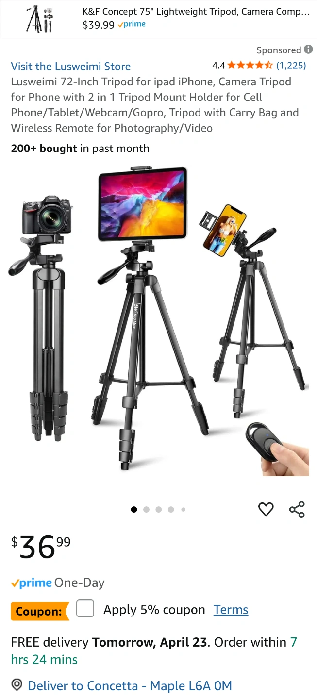 72-inch lightweight tripod, excellent for photography and videography. Compact and portable. Comes with remote, missing phone attachment. Bought on Amazon and missed window to return, didn't notice the missing piece.