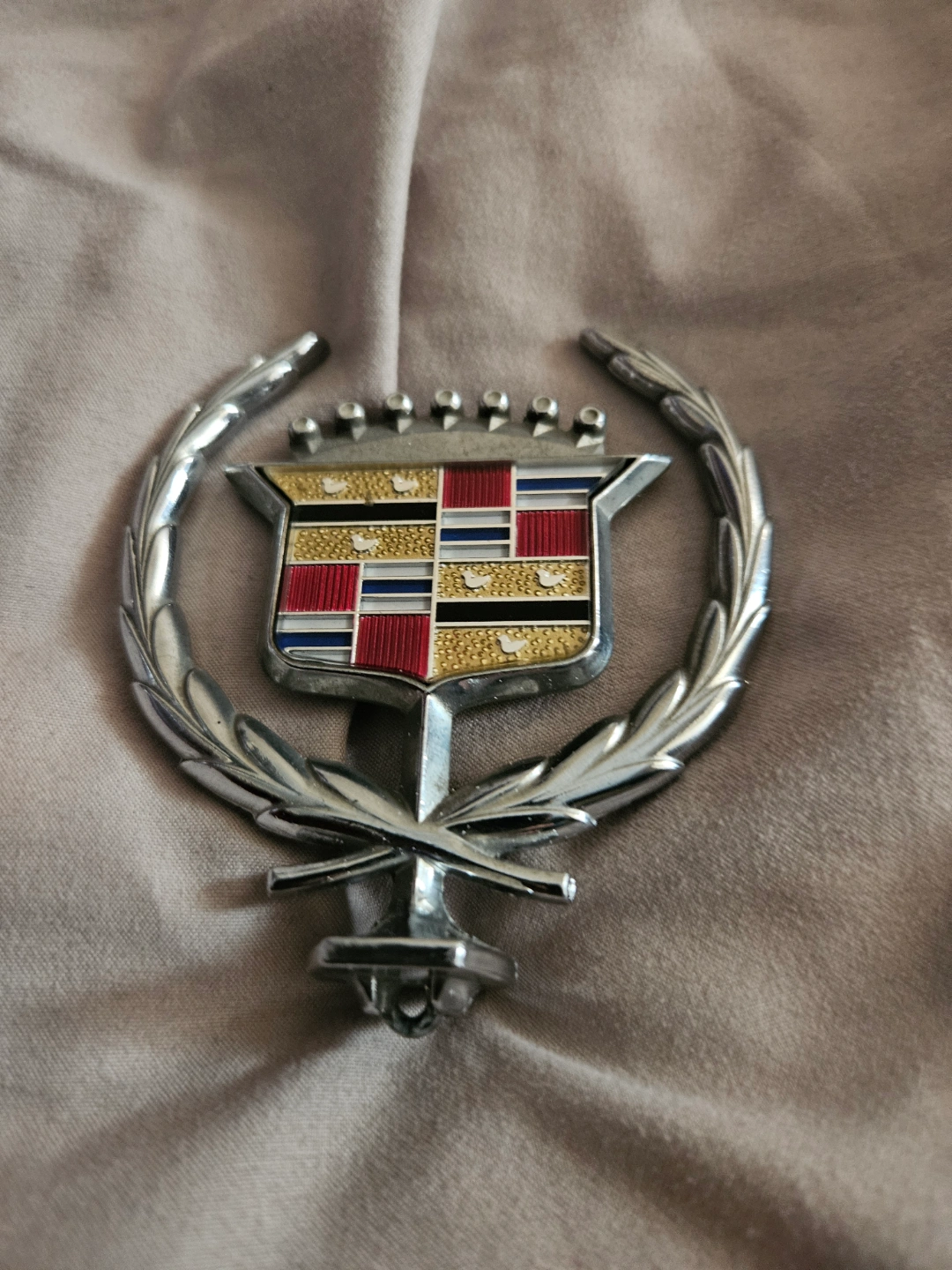 Classic Cadillac emblem. Chrome and enamel finish. Features wreath and crest design. Potential for restoration or display.